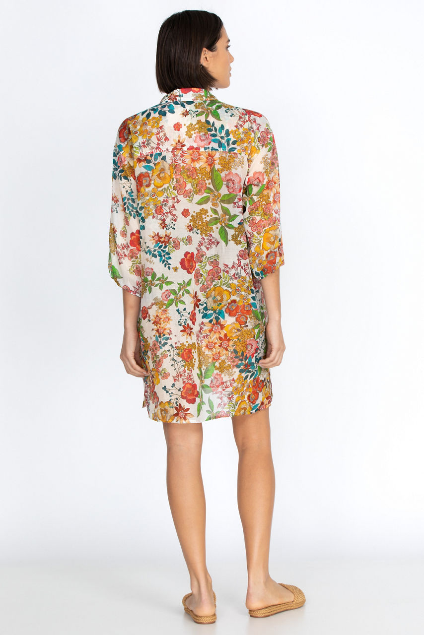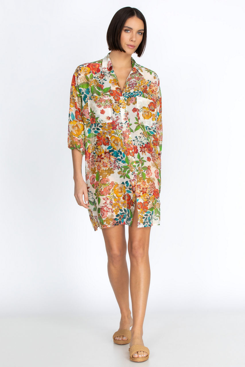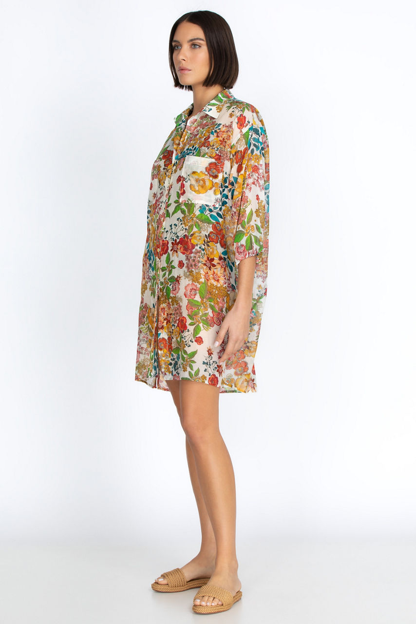 A vacation favorite, the Millo Shirt Dress is a practical beach staple that doesn't compromise on style. This shirt is made from a breathable cotton silk blend with a selection of vibrant flowers scattered across the front and back. Finished with two chest patch pockets, this shirt dress can be thrown on over a one piece or a bikini for a nonchalant finish.