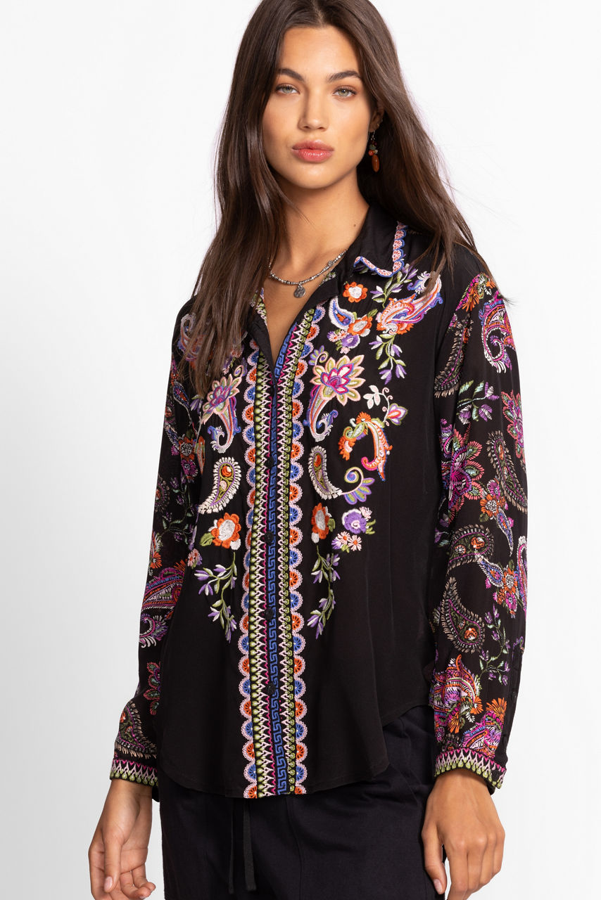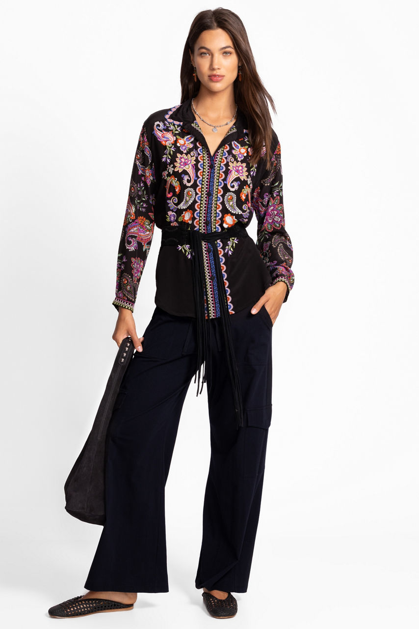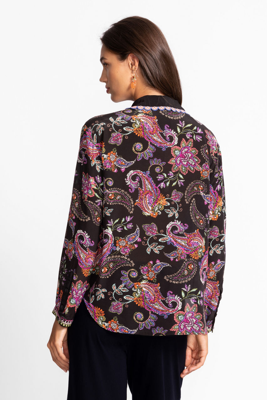 Crafted from 100% flowing silk, the Kora Mills Shirt is adorned with a vibrant pattern blending bold florals and colorful paisley. Designed with a collared button-front and long sleeves, this elegant shirt is finished with pleats and the cuffs and a curved hemline. Pair with a coordinating pencil skirt and classic pumps for a polished workday ensemble.