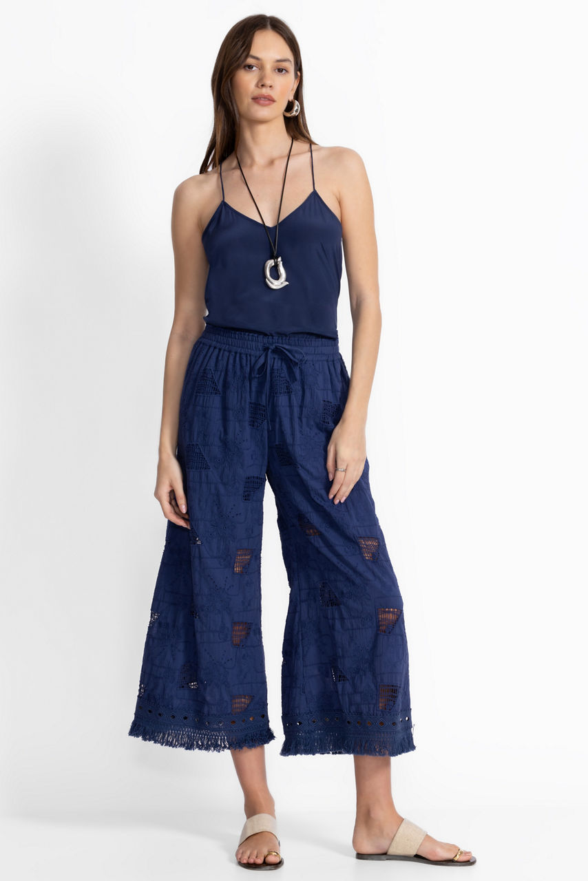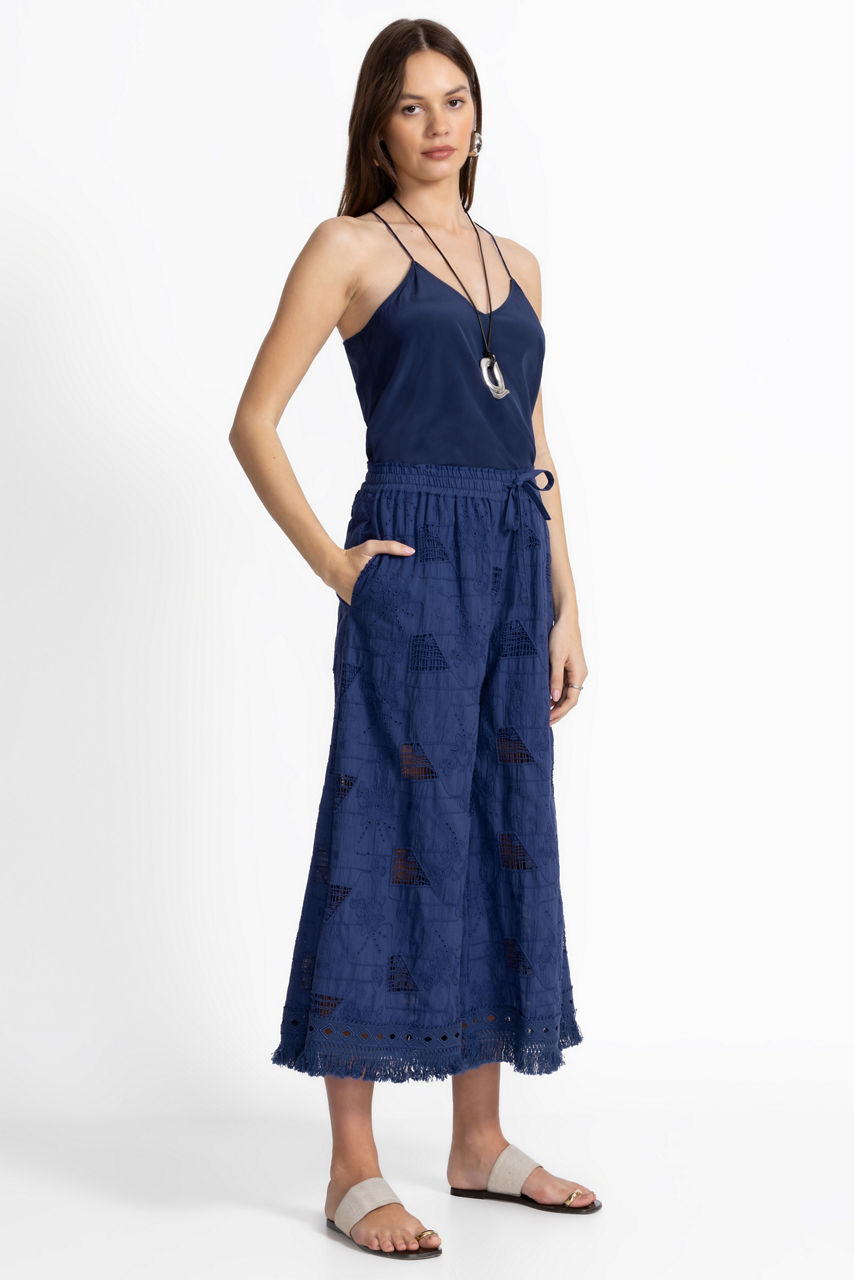 Crafted from 100% breathable cotton, the Minca Pants feature an ornate decorative pattern on a rich blue backdrop. Designed with an elastic waistband with a drawstring for a customizable fit, this flowing skirt is finished with slip pockets and a decorative fringe trim at the hemline. Pair with a gold silk cami and strappy heels for a polished night out.