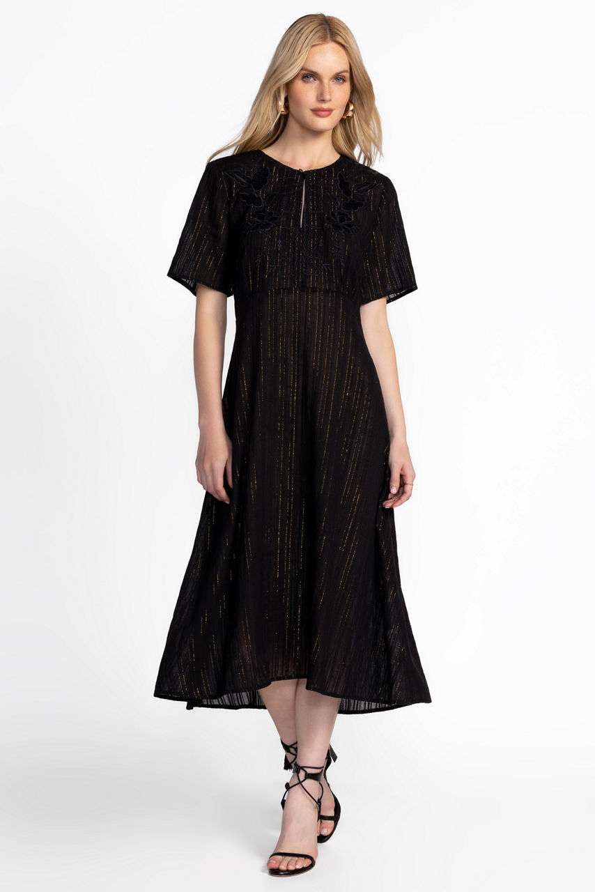 Crafted from a rich cotton blend embellished with a hint of metallic sparkle, the Mirah Effortless Dress is light and breezy. Featuring a Henley neckline and short sleeves, this slip-lined dress is finished with delicate placement embroidery for a feminine finishing touch. Pair with metallic heels and delicate jewelry for a perfectly polished look.