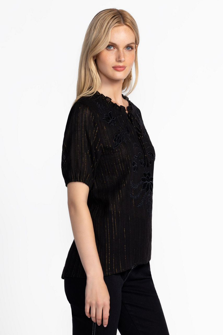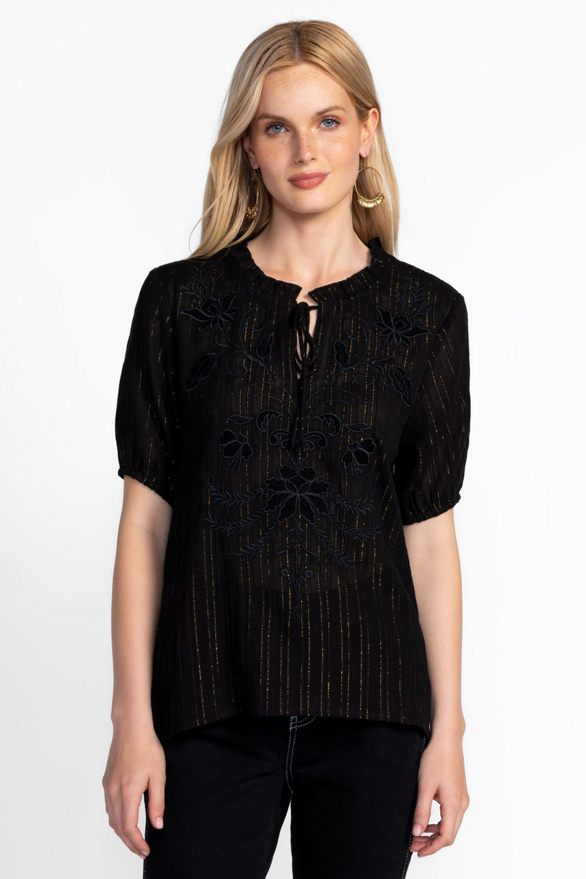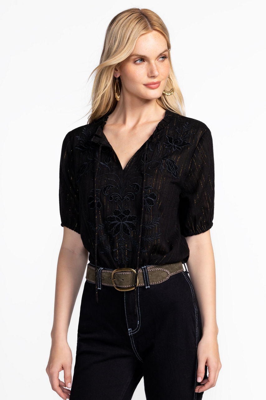 Crafted from a rich cotton blend embellished with a hint of metallic sparkle, the Mirah Field Blouse is fresh and feminine. Detailed with delicate embroidery at the yoke, this unique blouse features a split V-neckline and gently puffed sleeves for a softer silhouette. Pair with crisp denim and ankle boots for a thoughtfully curated look.