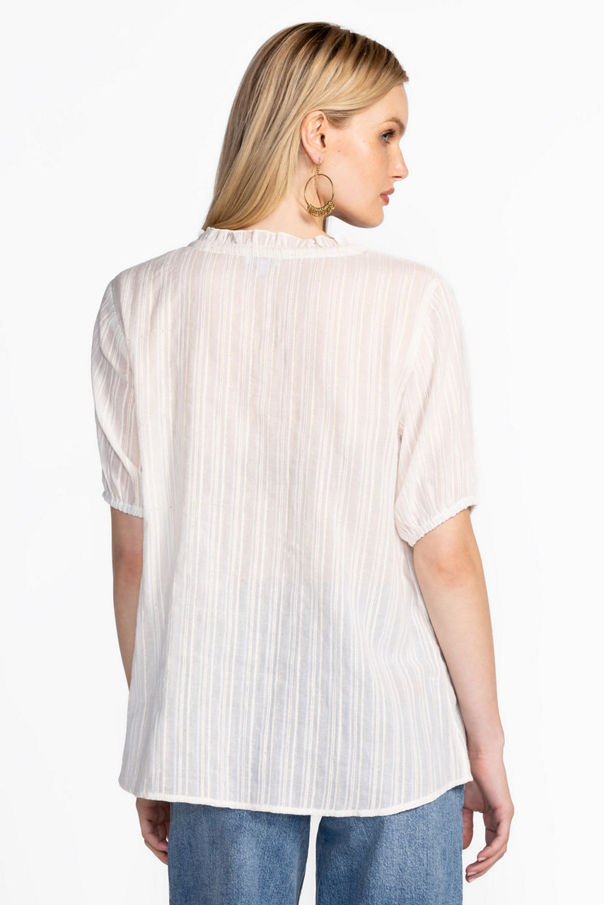 Crafted from a rich cotton blend embellished with a hint of metallic sparkle, the Mirah Field Blouse is fresh and feminine. Detailed with delicate embroidery at the yoke, this unique blouse features a split V-neckline and gently puffed sleeves for a softer silhouette. Pair with crisp denim and ankle boots for a thoughtfully curated look.