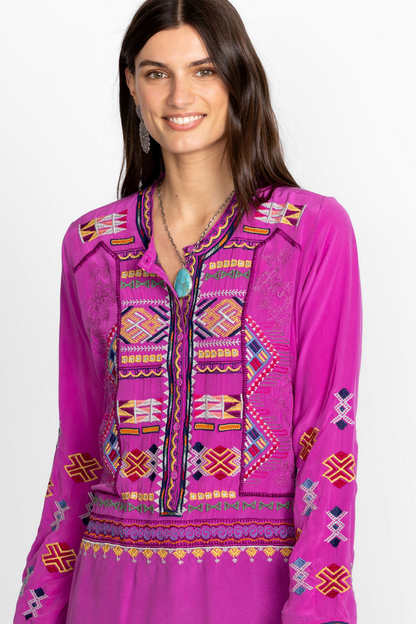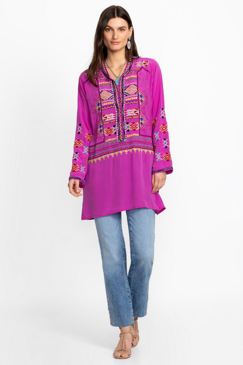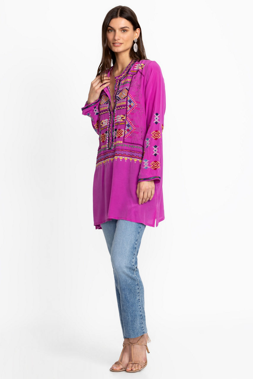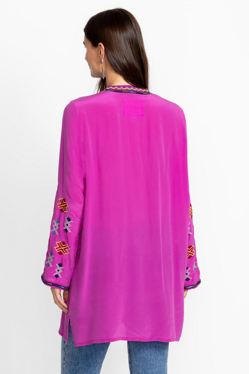 Crafted from luxurious 100% silk, the Miraz Tunic is washed in brilliant color. Featuring a Henley neckline bordered by an intricately embroidered placket, this tunic is embellished with bold color and is finished with side slits for easy movement. Pair with coordinating leggings and leather sandals for a polished casual look.
