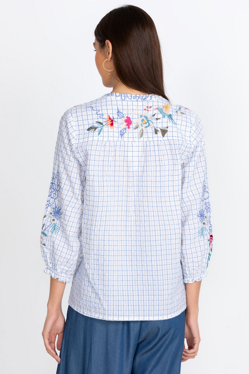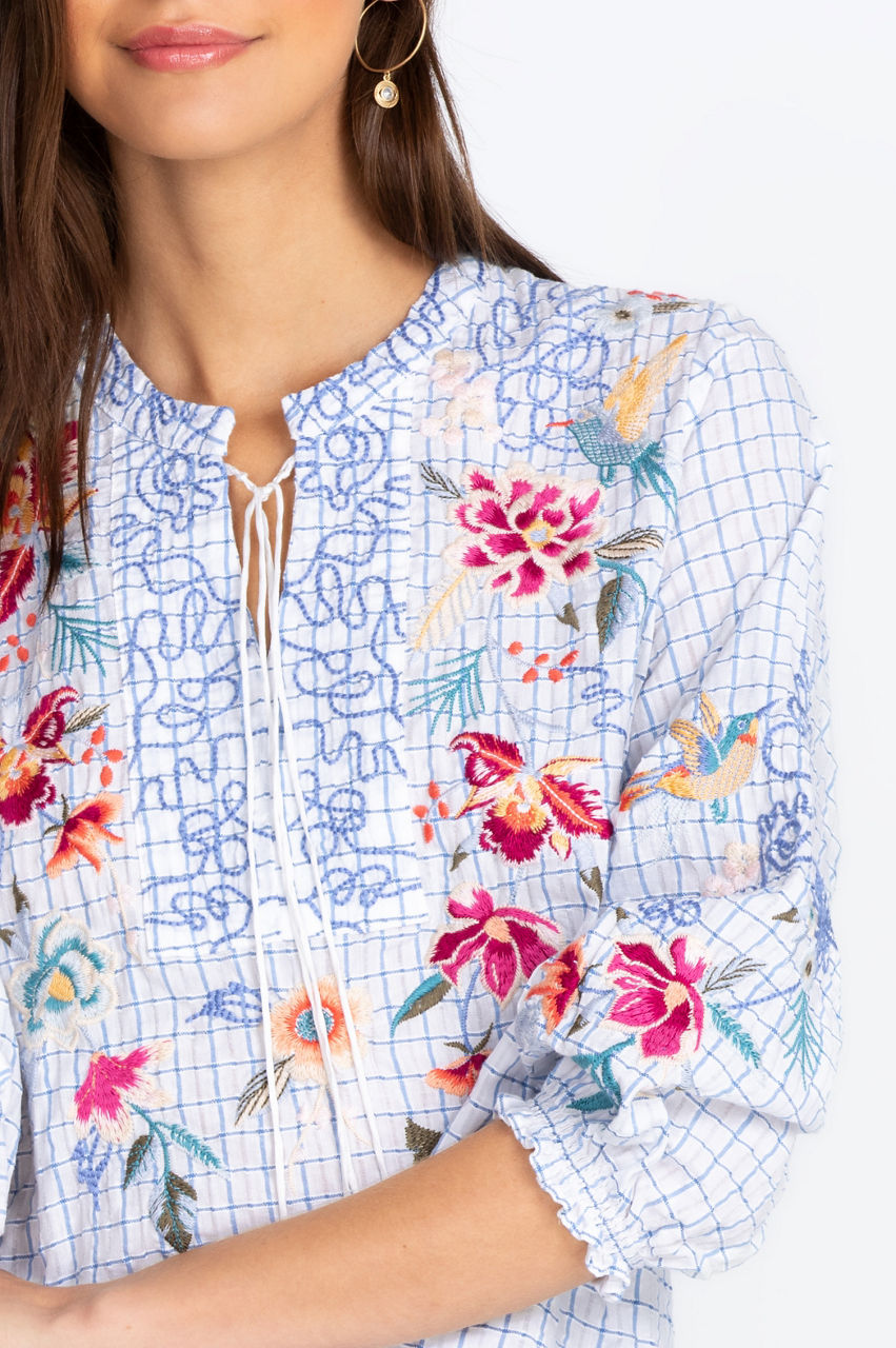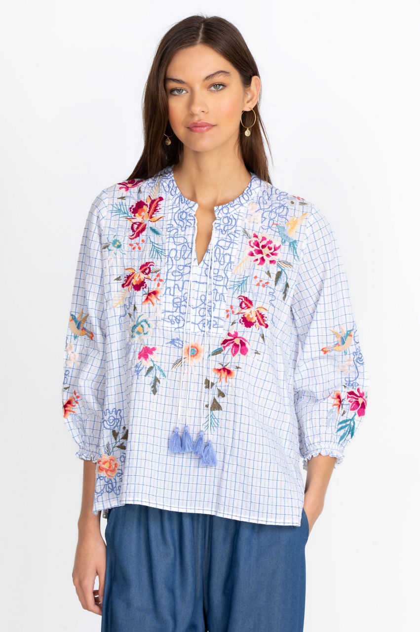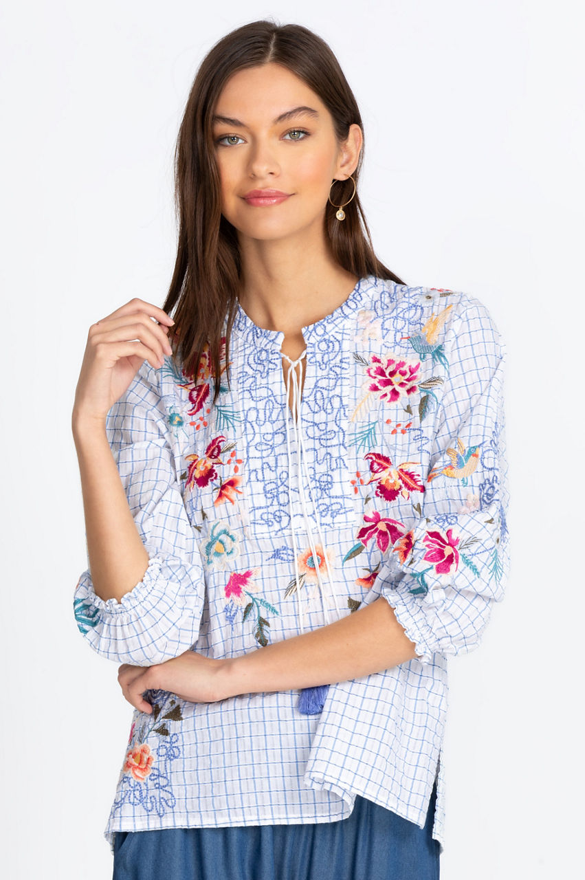 Our intricate floral pattern is embroidered on the front and back of the Miro Tassle Blouse, which comes in plaid and can be a stylish new resident in your summer closet, adding great versatility. The cuffed sleeves and scoop neckline are beautiful touches. Throw it on with a pair of khaki shorts or jeans to look your best on a casual summer day.