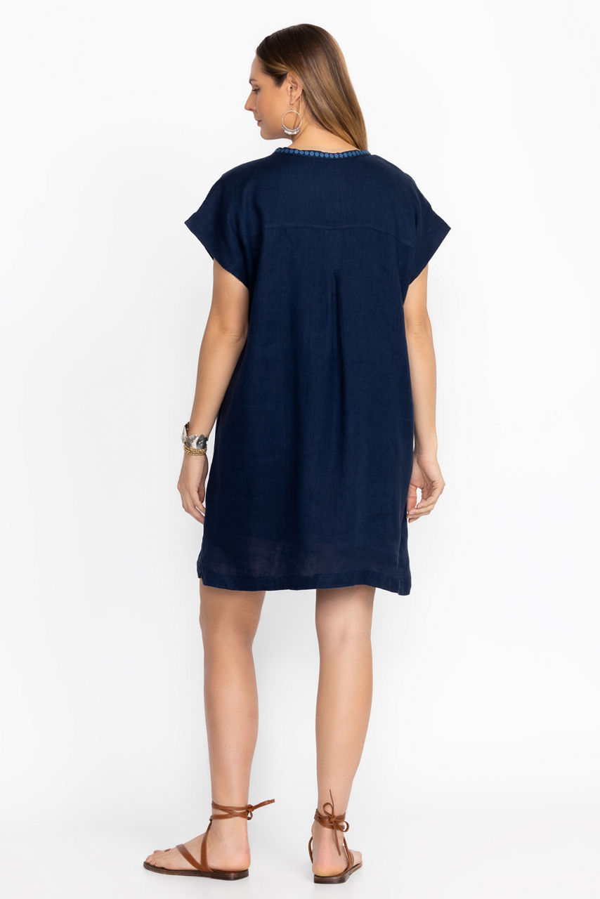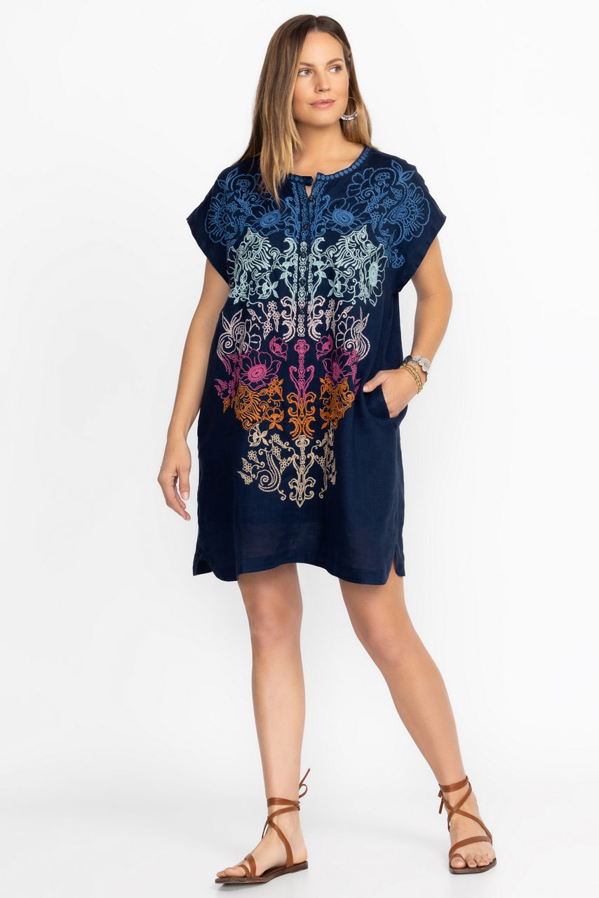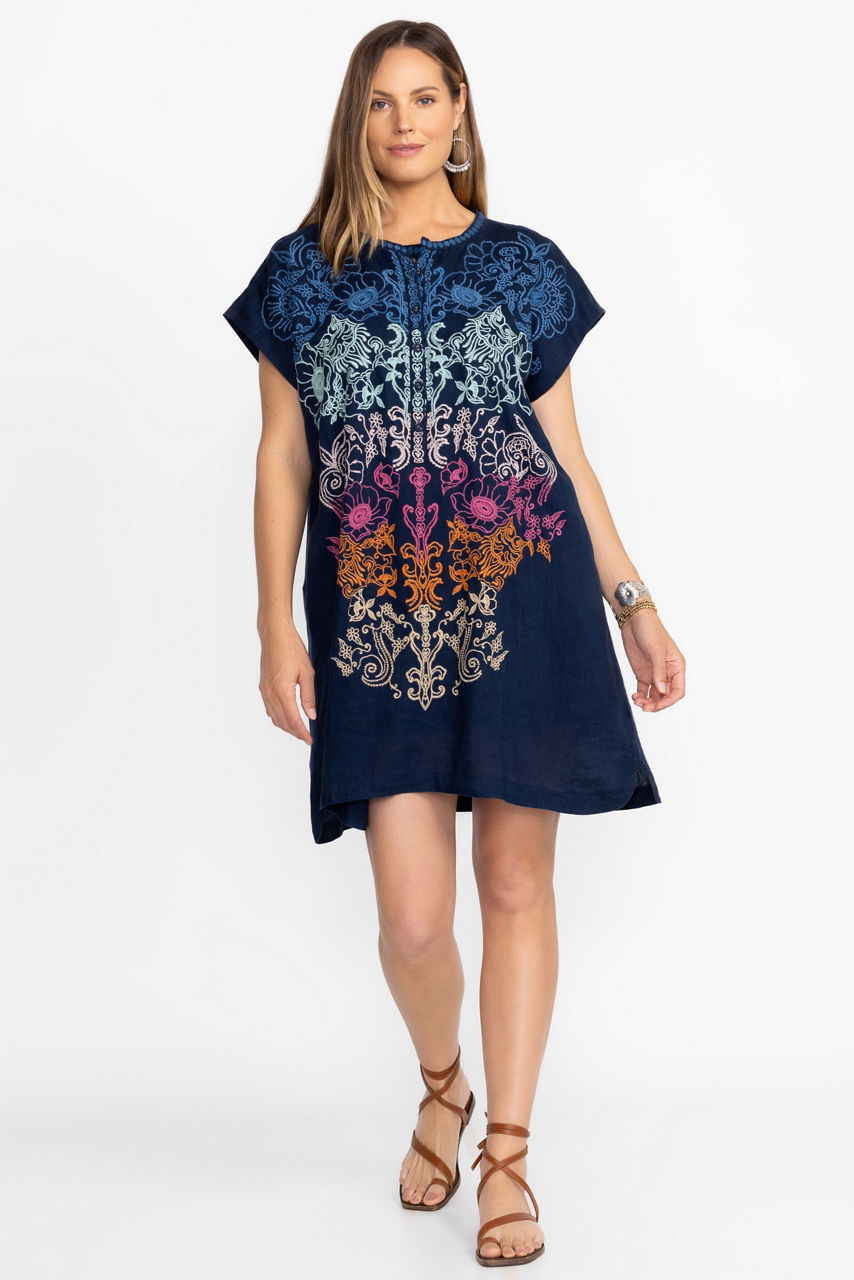 Crafted from 100% breathable linen, the Ellia Mishti Dress is embellished with colorful floral embroidered patterns. Featuring a Henley neckline and capped Dolman sleeves bordered with splashes of bold color, this breezy dress offers a straight silhouette. Pair with leather sandals and a cross-body raffia bag for a resort-ready look.