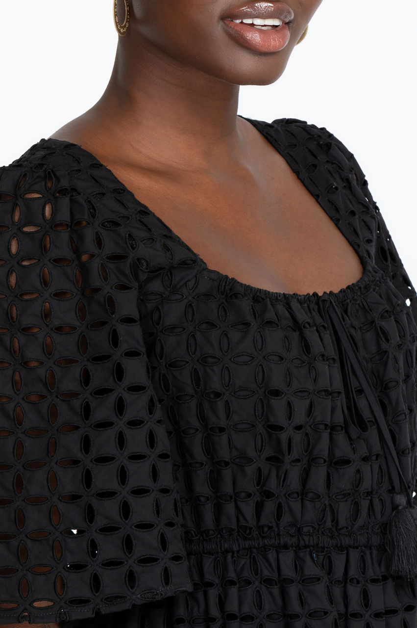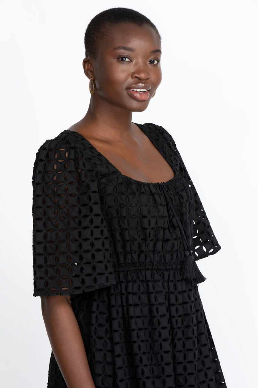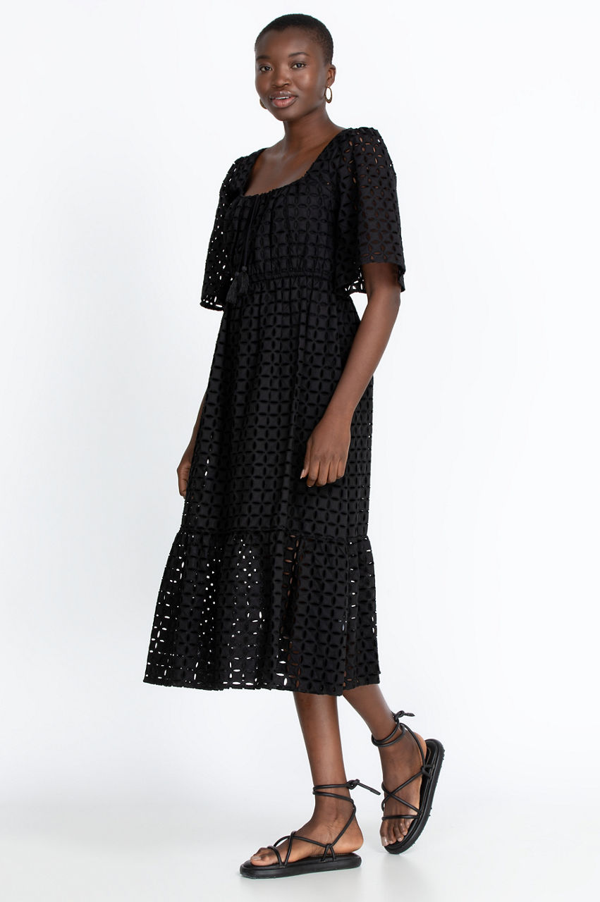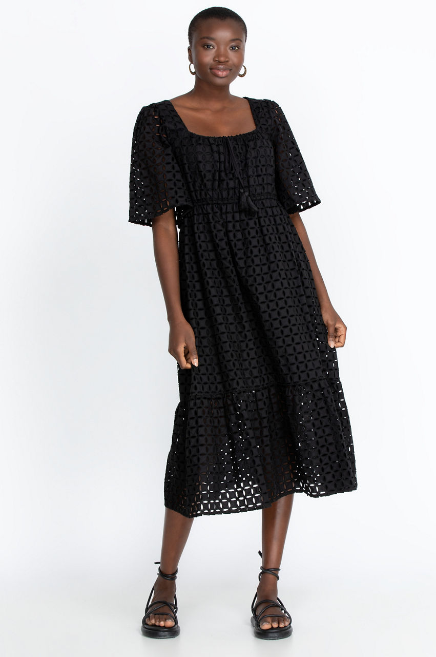 Simplicity itself, with a square neckline and short sleeves, our Misty Midi Dress will carry you through every occasion. Tassels drape beautifully from the center of the neckline to the elastic waist. A ruffled lower-tier adds to the allure. Pair this dress with sky-high strappy sandals for formal events or demure Mary Jane heels for more conservative venues.