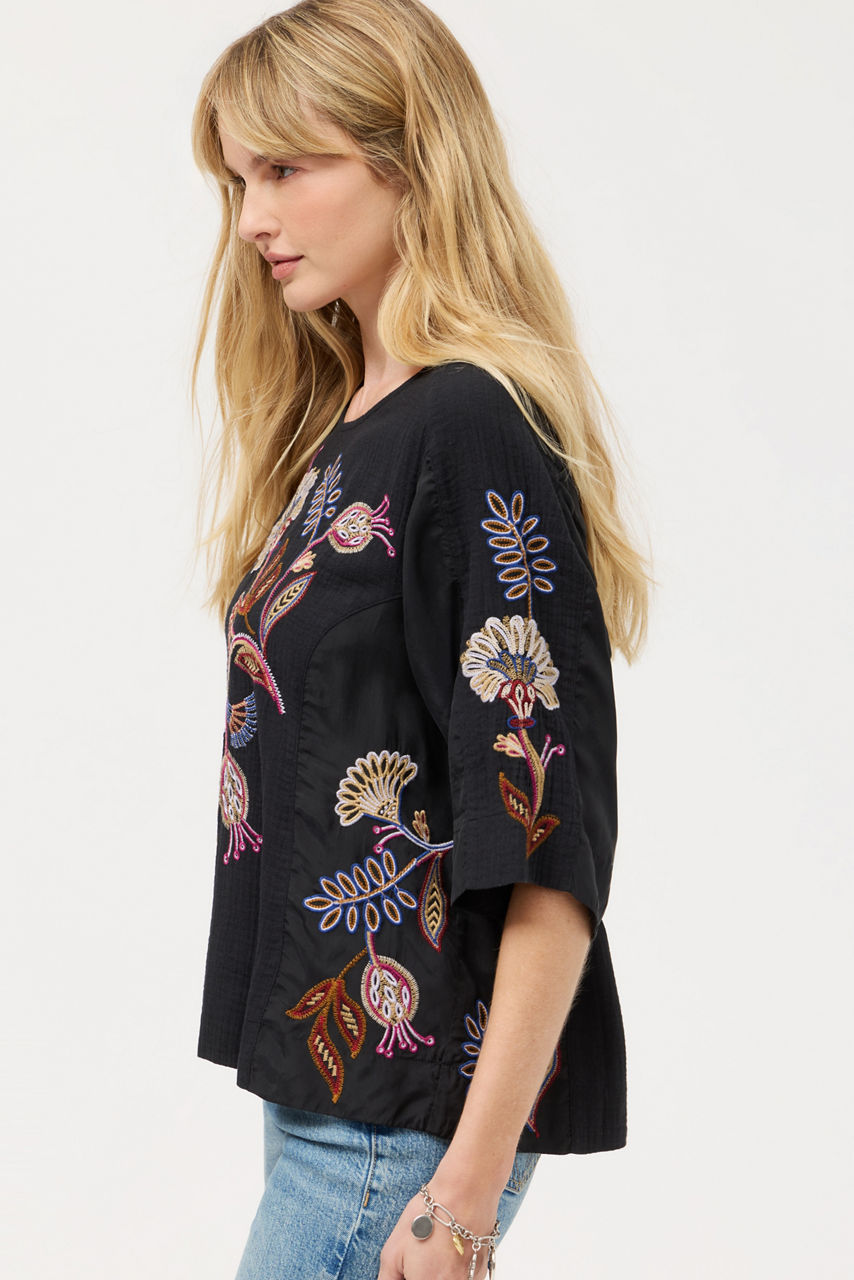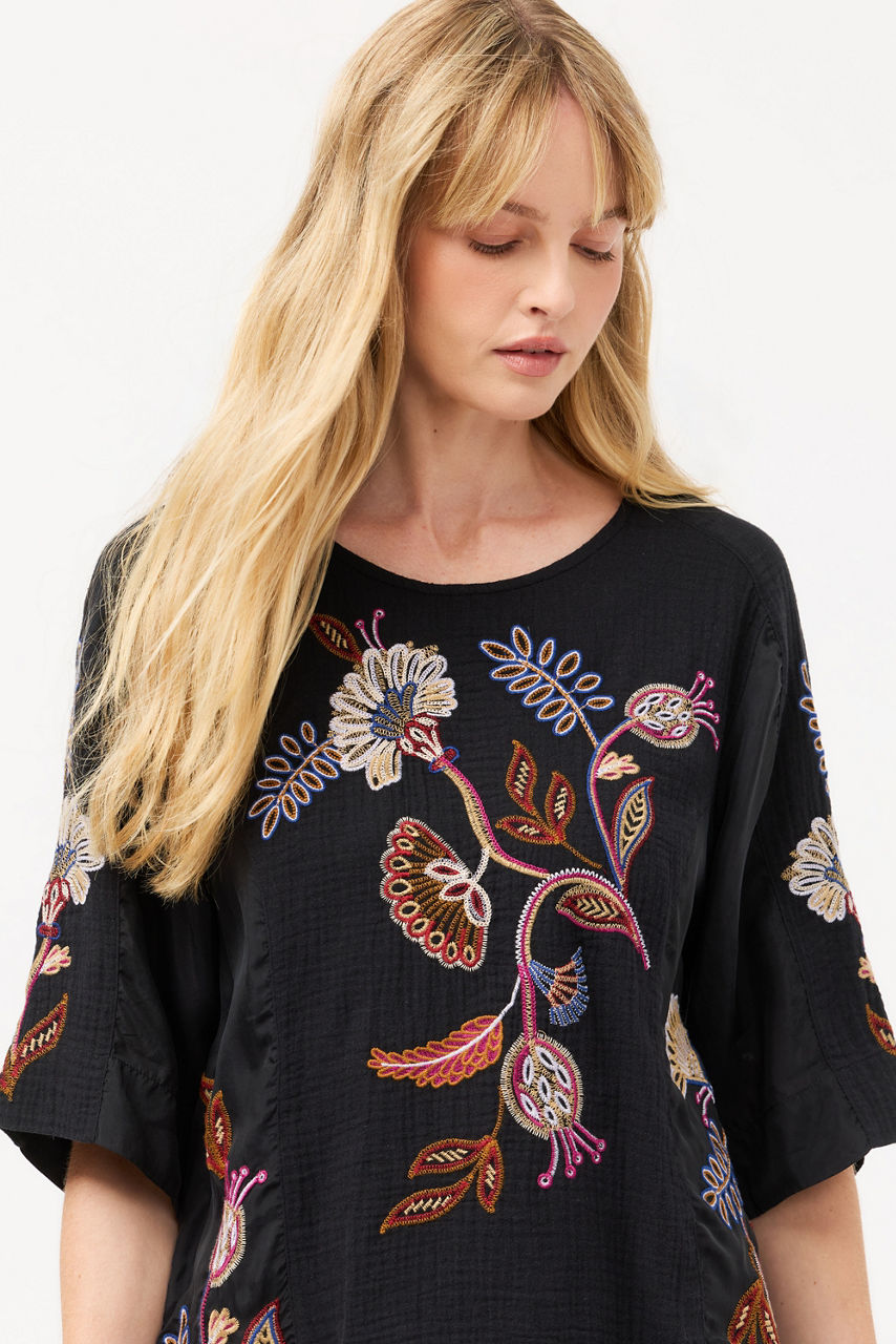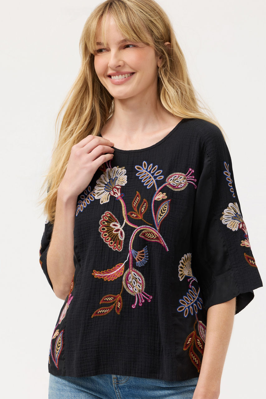 Crafted from breathable 100% cotton, the Gineva Mixed Media Dolman Blouse is adorned with vibrant floral embroidered details. Featuring a curved neckline and a keyhole back, this relaxed-fit top is finished with a series of princess seams with panels of different materials for added texture. Pair with relaxed-fit denim and coordinating flats for lunch date.