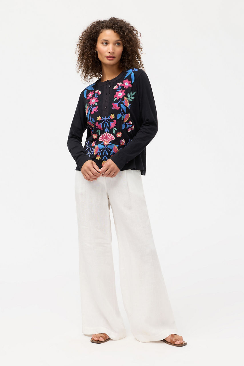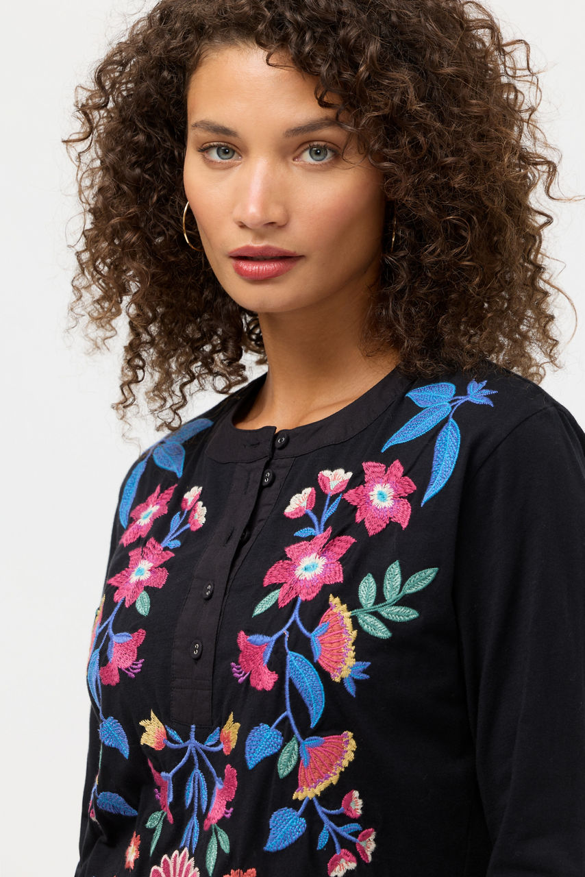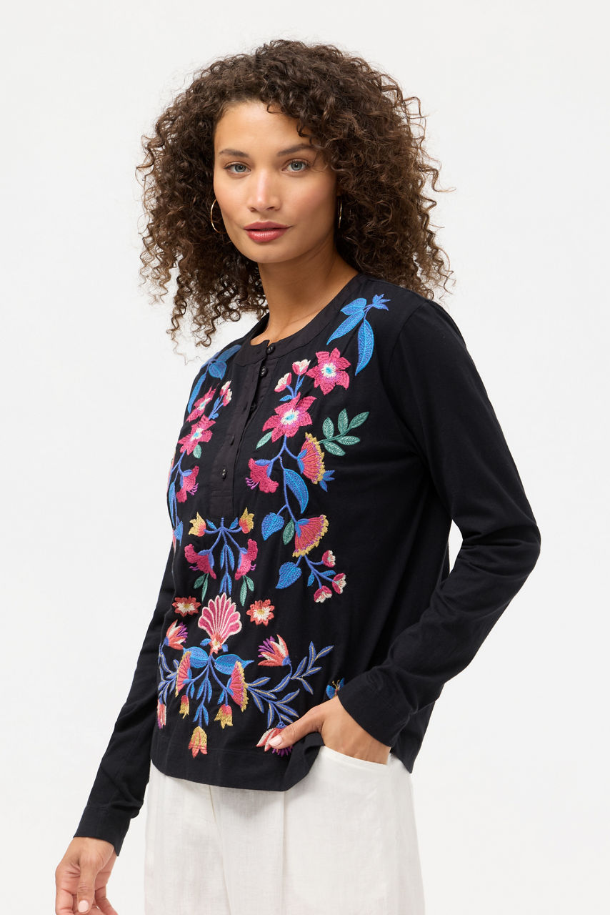 Expertly embellished with vibrant floral and fauna, the Mixed Media Henley T-shirt offers a fresh take on a classic wardrobe staple. Designed with a Henley neckline and long sleeves, this casual tee is finished with a curved hemline for an elevated look. Pair with relaxed chinos and easy loafers for a weekend wardrobe update.