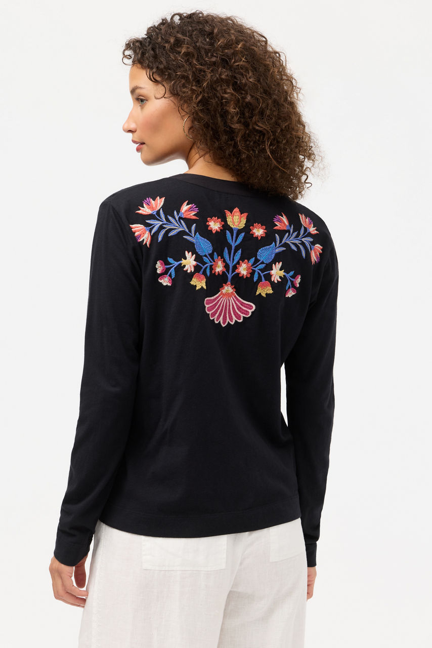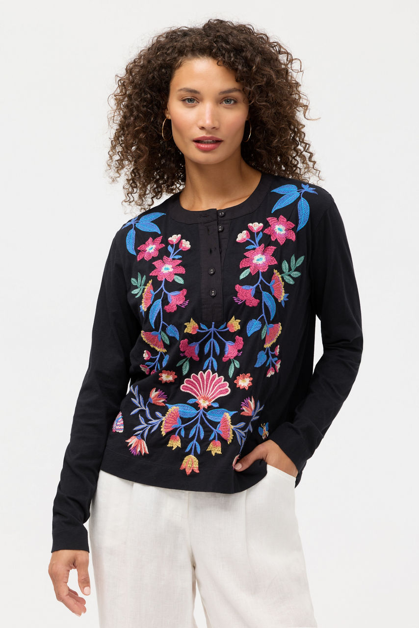 Expertly embellished with vibrant floral and fauna, the Mixed Media Henley T-shirt offers a fresh take on a classic wardrobe staple. Designed with a Henley neckline and long sleeves, this casual tee is finished with a curved hemline for an elevated look. Pair with relaxed chinos and easy loafers for a weekend wardrobe update.
