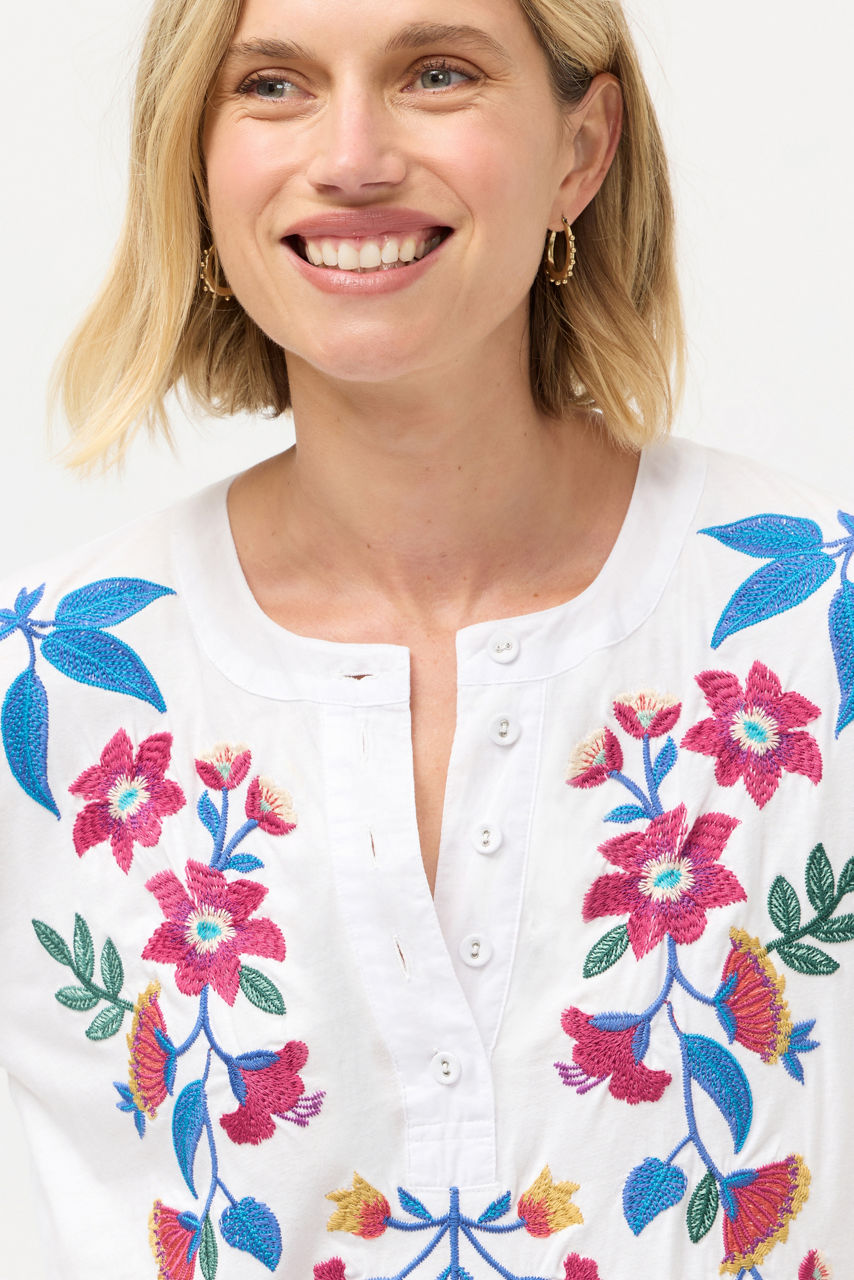 Expertly embellished with vibrant floral and fauna, the Mixed Media Henley T-shirt offers a fresh take on a classic wardrobe staple. Designed with a Henley neckline and long sleeves, this casual tee is finished with a curved hemline for an elevated look. Pair with relaxed chinos and easy loafers for a weekend wardrobe update.