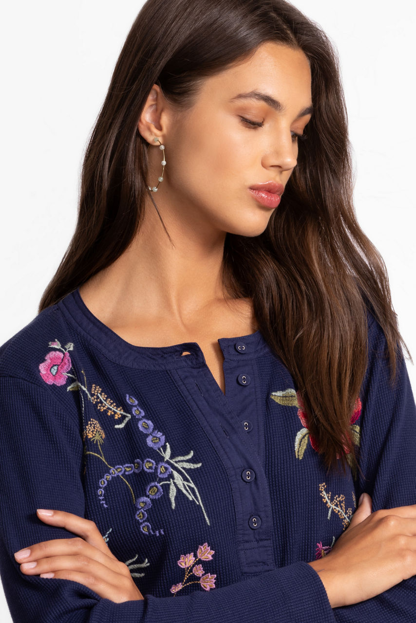 Beautifully embellished with colorful floral embroidery detailing, the Mixed Media Henley Thermal offers a fresh take on a traditional wardrobe staple. Crafted from a cotton blend, this casual top features a Henley neckline and long sleeves and is finished with a straight hemline. Pair with cargo joggers and fashion sneakers for a fresh weekend look.