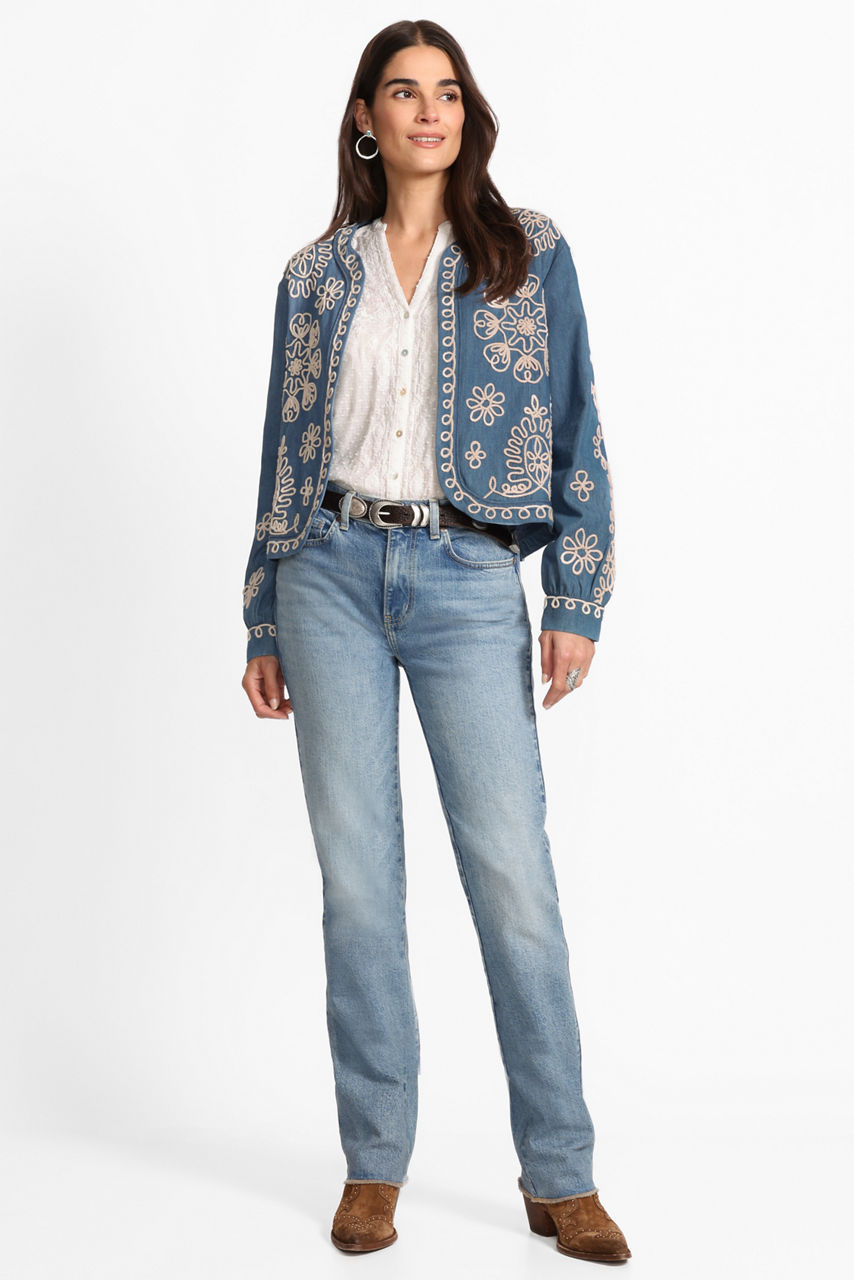 Crafted from breathable 100% cotton, the Mixed Media Hi Lo Shirt offers a fresh feminine take on classic shirting. Featuring intricate tone-on-tone embroidered detailing and a V-neckline, this button-front shirt is finished with a curved hi-lo hemline. Pair with linen palazzo pants and easy slides for an elevated resort-inspired look.