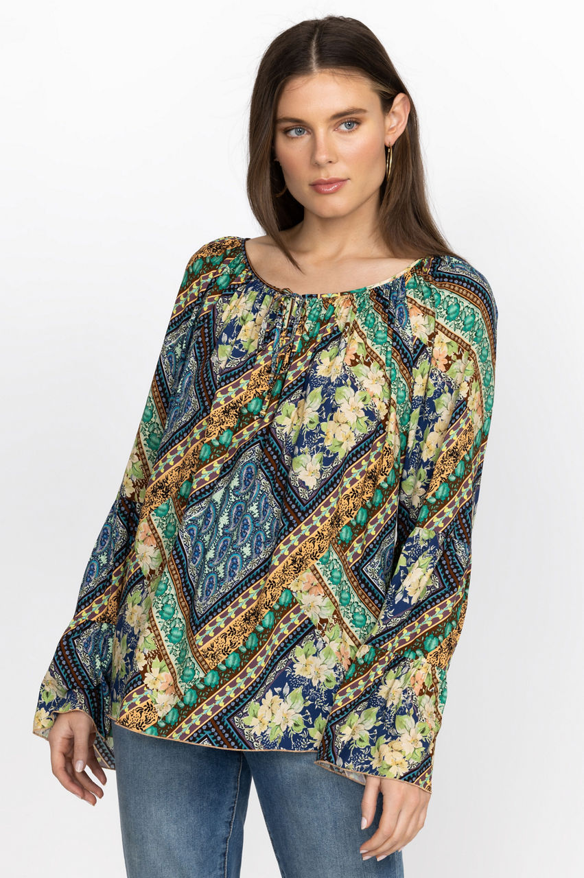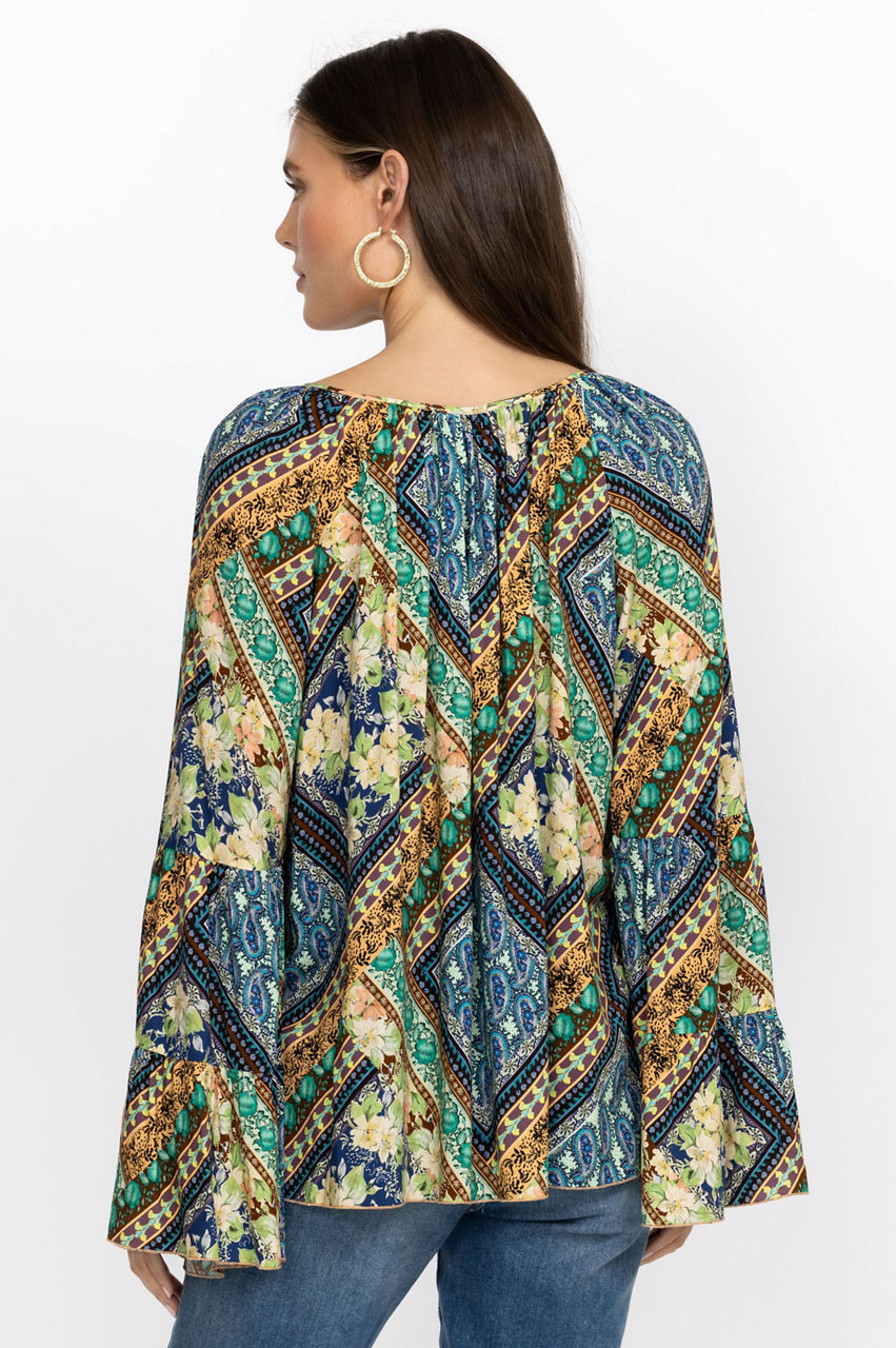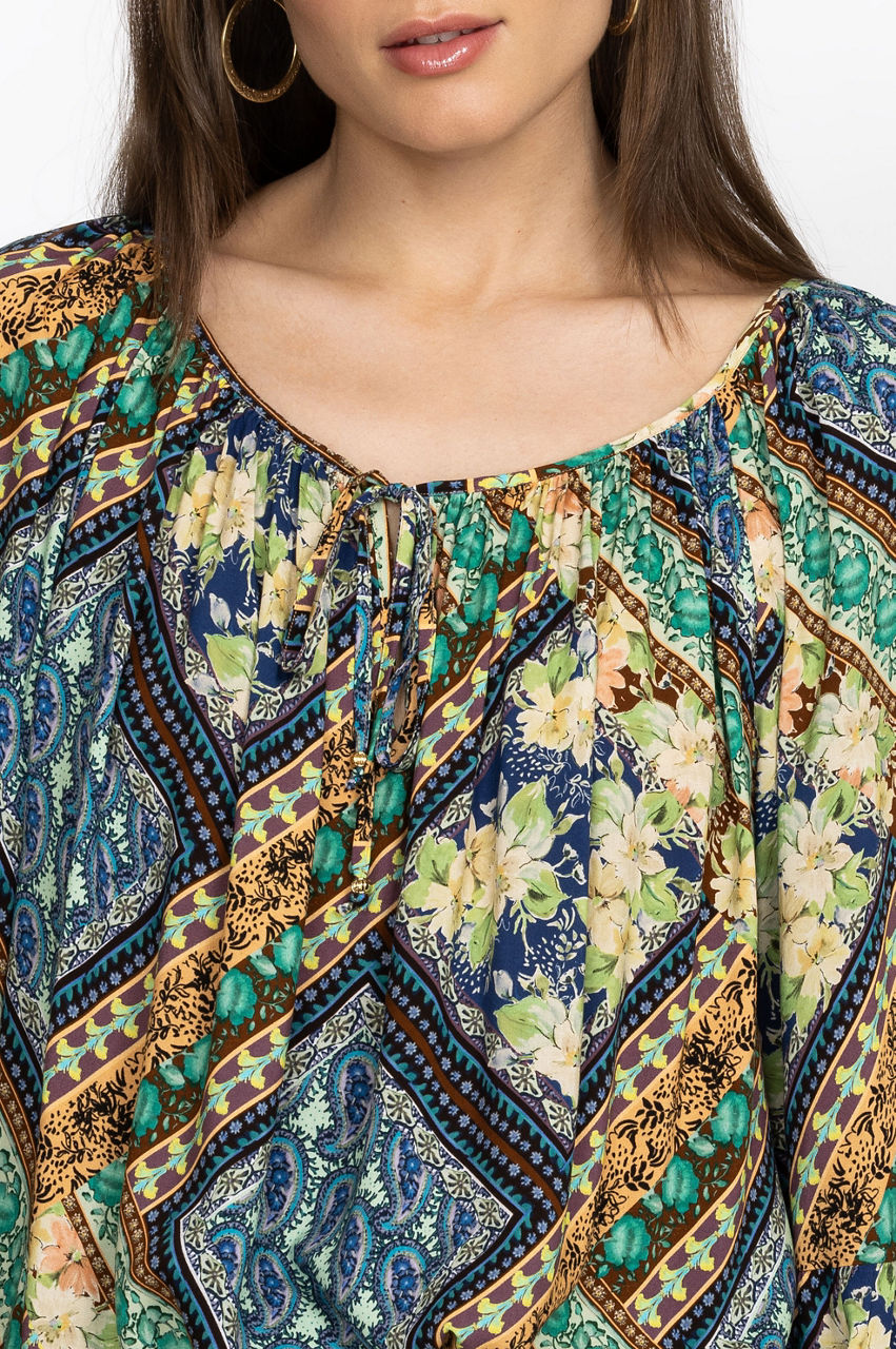 Infused with a summer-inspired mood, the Miza Tiered Blouse is a chic-yet-relaxed style for beach vacations and warmer days spent outdoors. This floaty blouse is made from smooth rayon with a round neck and embellished with a mesmerizing square and floral print. Pair it with tiered printed pants for a bohemian-inspired beach look.