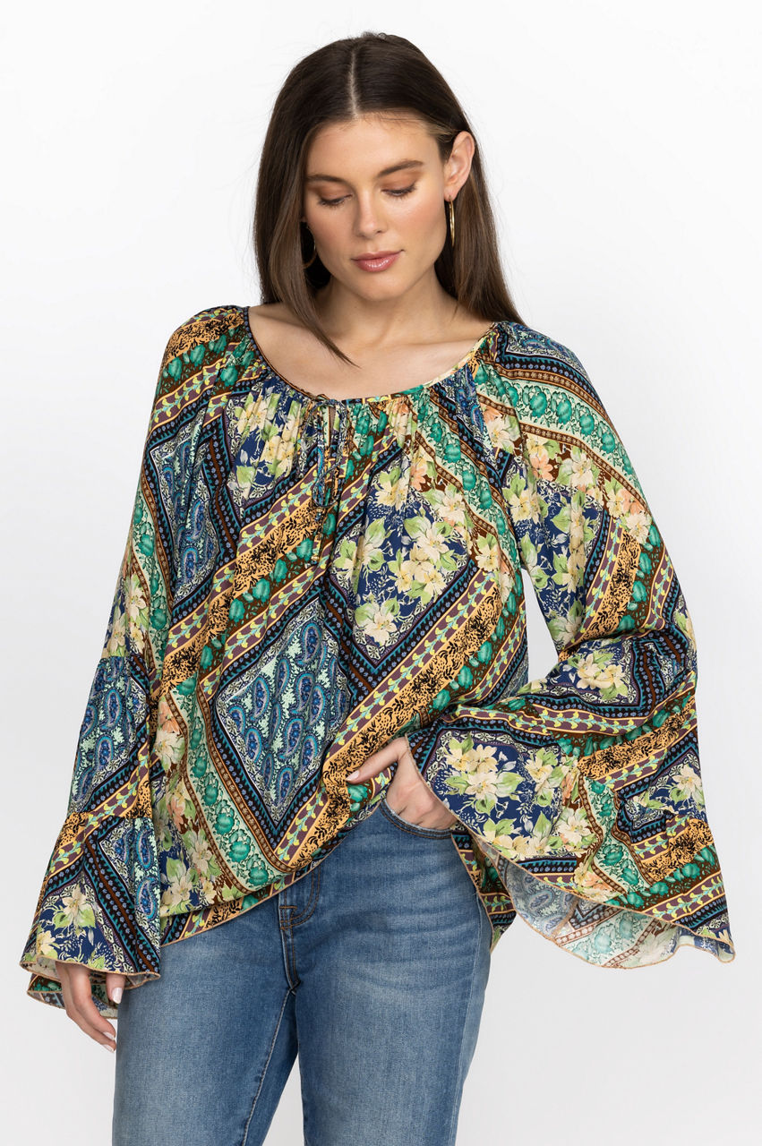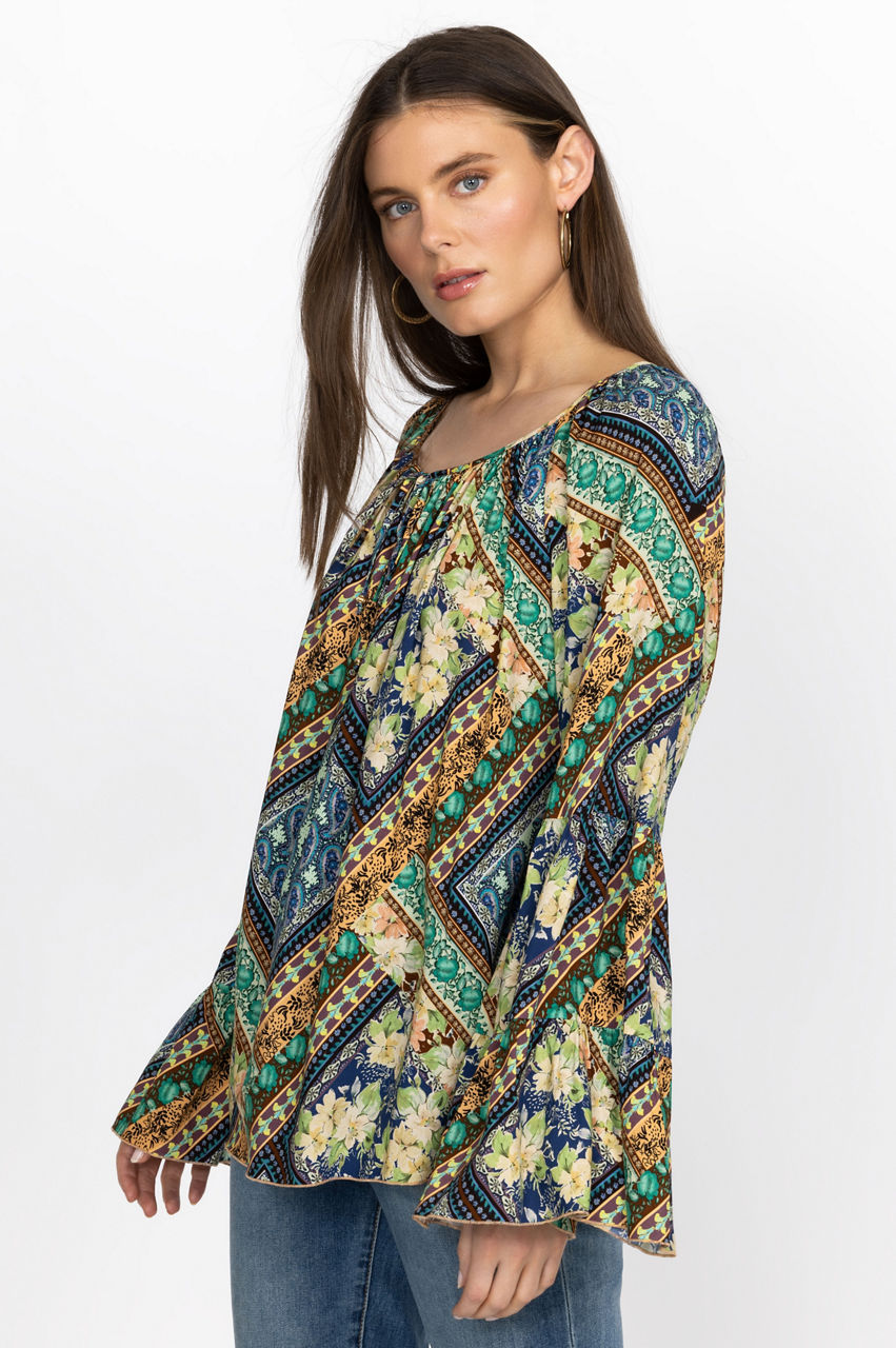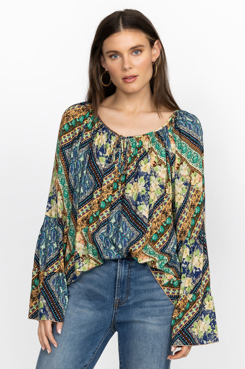 Infused with a summer-inspired mood, the Miza Tiered Blouse is a chic-yet-relaxed style for beach vacations and warmer days spent outdoors. This floaty blouse is made from smooth rayon with a round neck and embellished with a mesmerizing square and floral print. Pair it with tiered printed pants for a bohemian-inspired beach look.