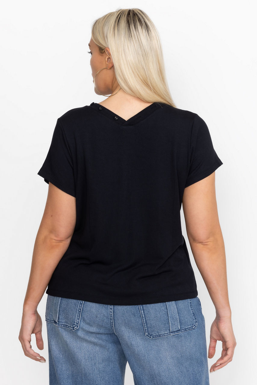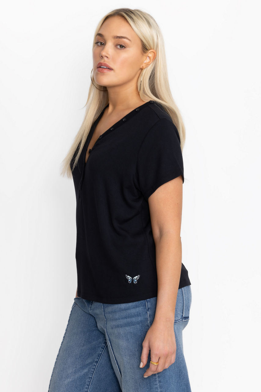 Crafted from a super soft modal blend with a hint of stretch, the Modal Jersey Button Neck Tee offers a modern take on classic sportswear. Featuring a curved V-neckline with decorative buttons, this short sleeve tee creates a relaxed fit with a custom feel. Pair with linen shorts and fashion sneakers to take on the warmest days.