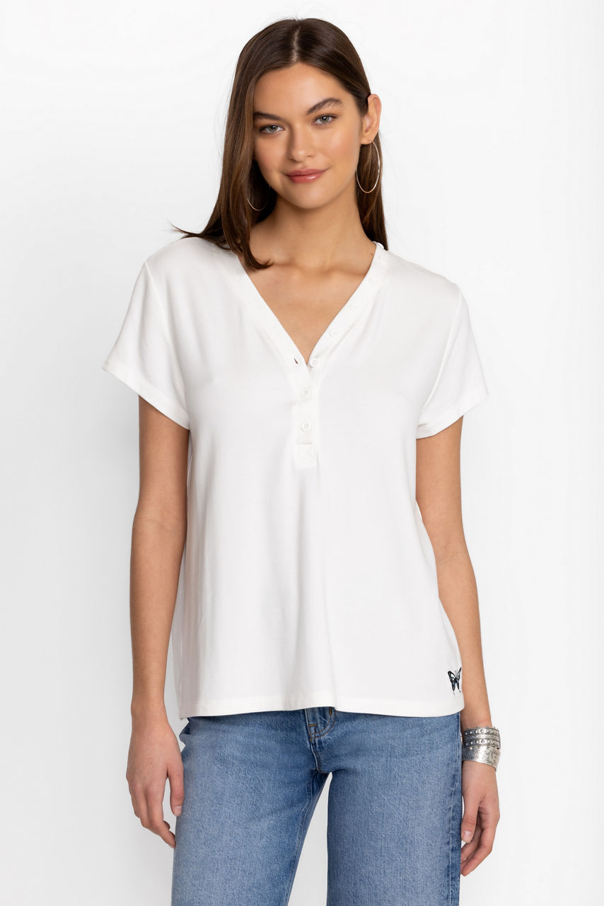Thoughtfully crafted from luxuriously soft modal fabric with a hint of stretch, the Modal Jersey Button Neck Tee offers an updated take on a classic Tee. Featuring a V-neckline accented with a wide Henley placket and button detailing, this relaxed-fit tee is finished with a straight hemline. Pair with relaxed denim and fashion sneakers for a day of errands.