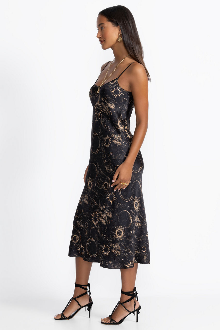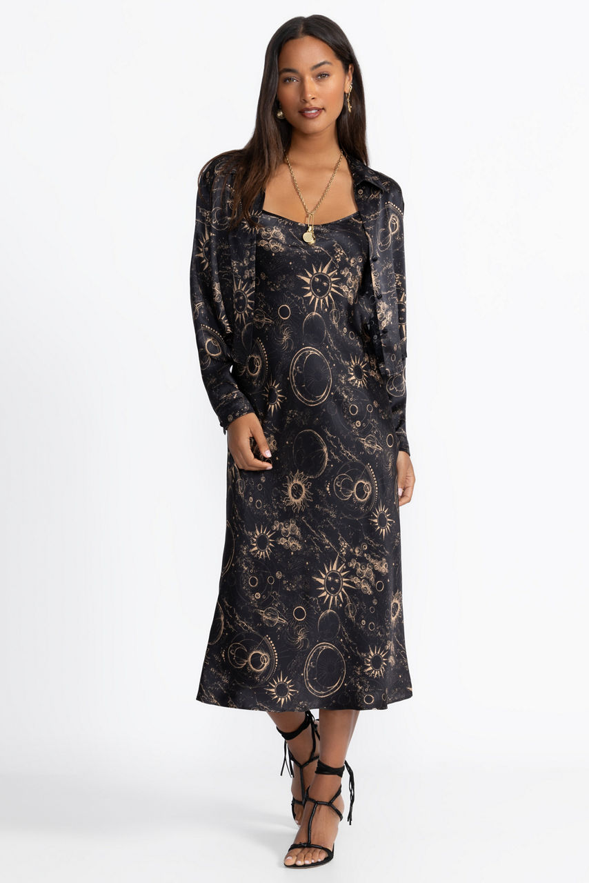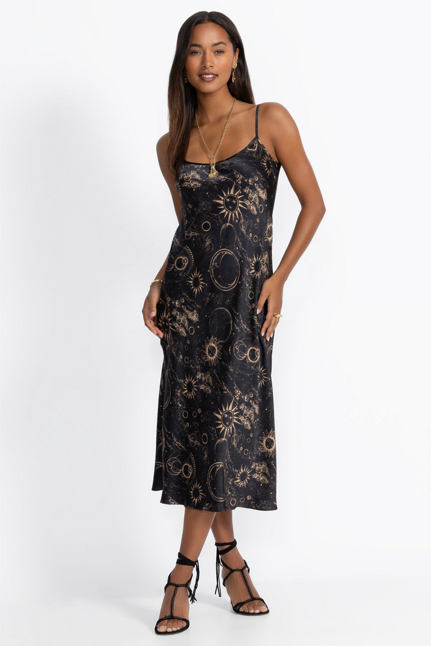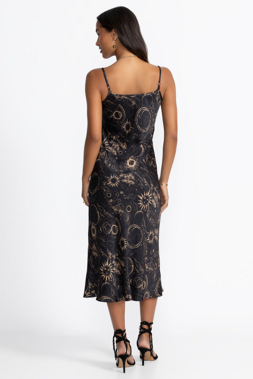 Beautifully crafted from 100% luxurious silk, the Modern Slip Dress is both simple and glamorous. Adorned with celestial images from the night sky, this lovely dress features adjustable spaghetti straps and a scoop neckline and drapes in a maxi-length skirt. Pair with gold metallic heels and gold jewelry for a girls' night out.