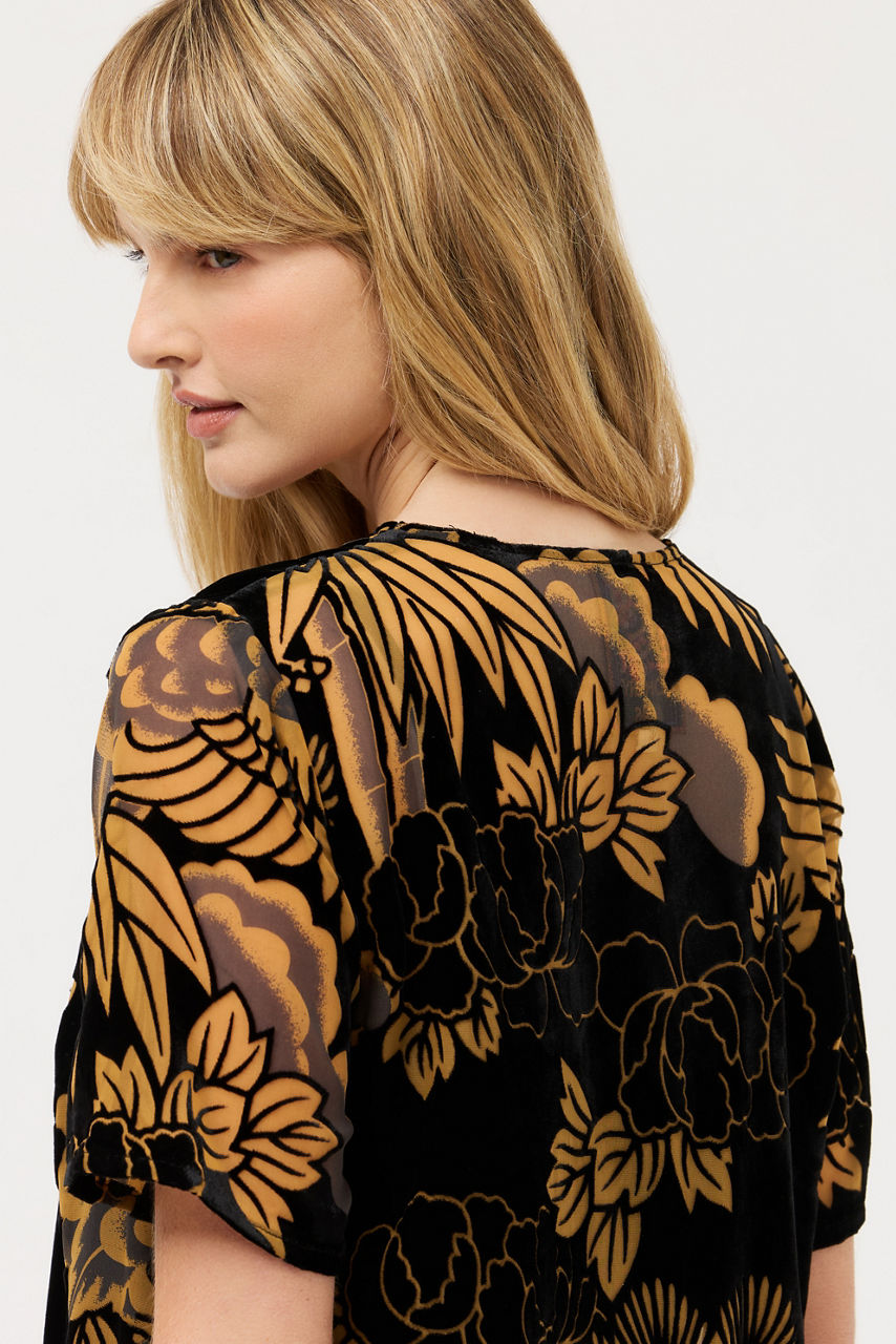 Boldly embellished with a metallic burnout pattern, the Modet Short Dress is adorned with vibrant flora and fauna. Designed with a keyhole front with a button loop closure, this slip-lined shift dress is finished with shorts sleeves and a straight hemline. Pair with metallic heels and stunning gold jewelry for a polished evening look.