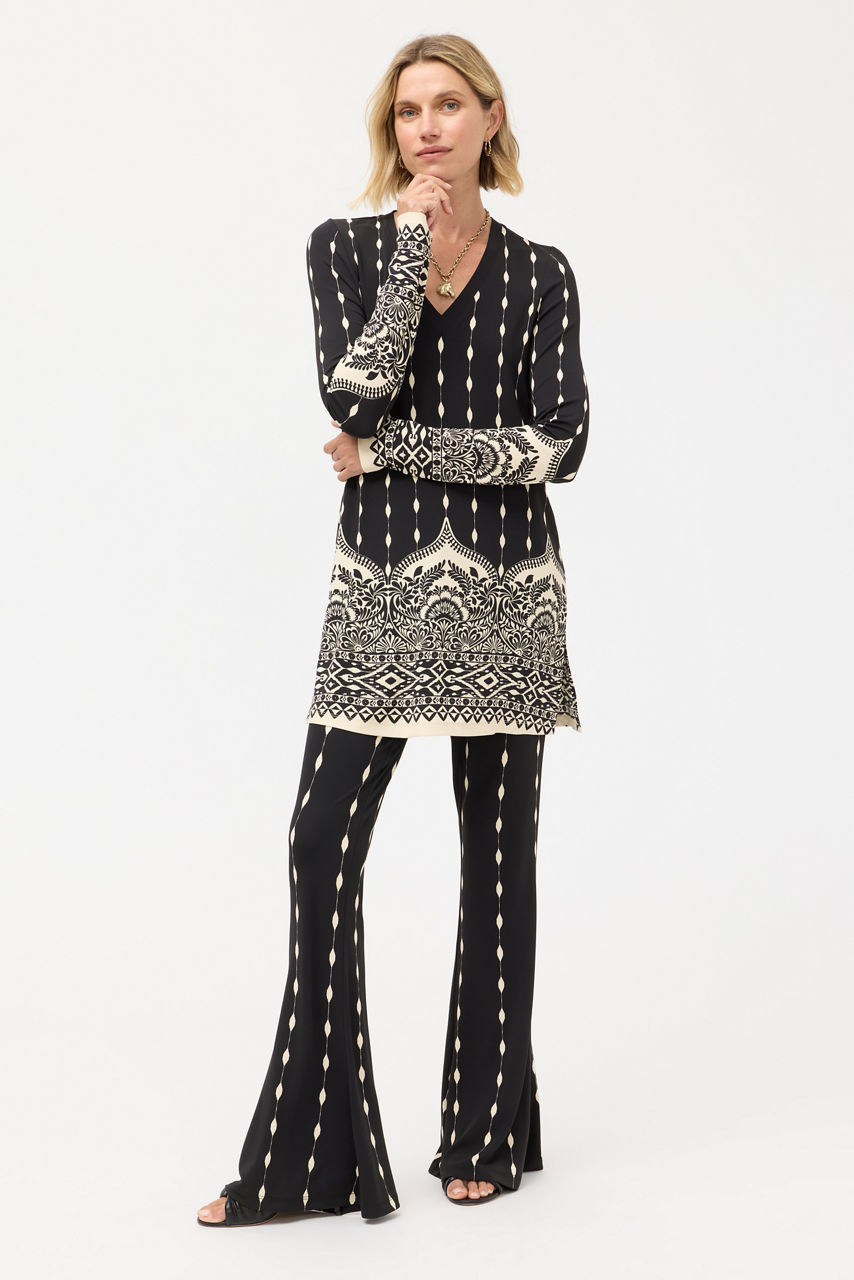 Embellished with a mesmerizing pattern in contrasting black and white tones, the Mollee Flare Pant is equal parts comfort and style. Designed with an elastic waist and flared legs, these bold pants are a unique wardrobe addition. Pair with the Demi V-Neck Tunic and colorful flats for an elevated casual look.
