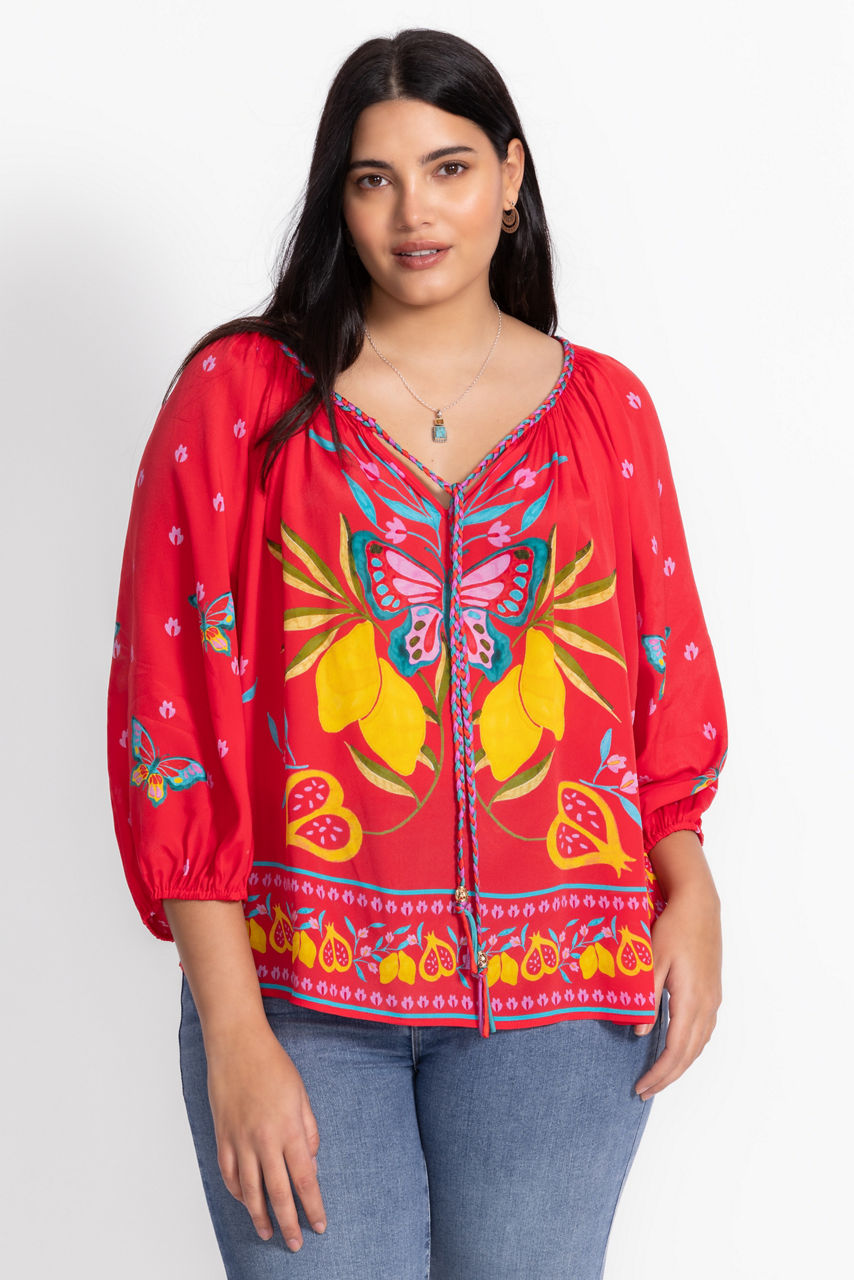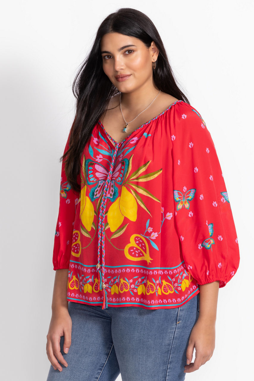 Crafted from a unique silk blend, the Monaco Peasant Blouse is ornately detailed with vibrant color and an exciting pattern. Designed with a keyhole neckline embellished with a contrasting trim and tie closure, this bold blouse is finished with elbow-length sleeves. Wear it with coordinating palazzo pants and colorful jewelry pieces for a resort-inspired ensemble.