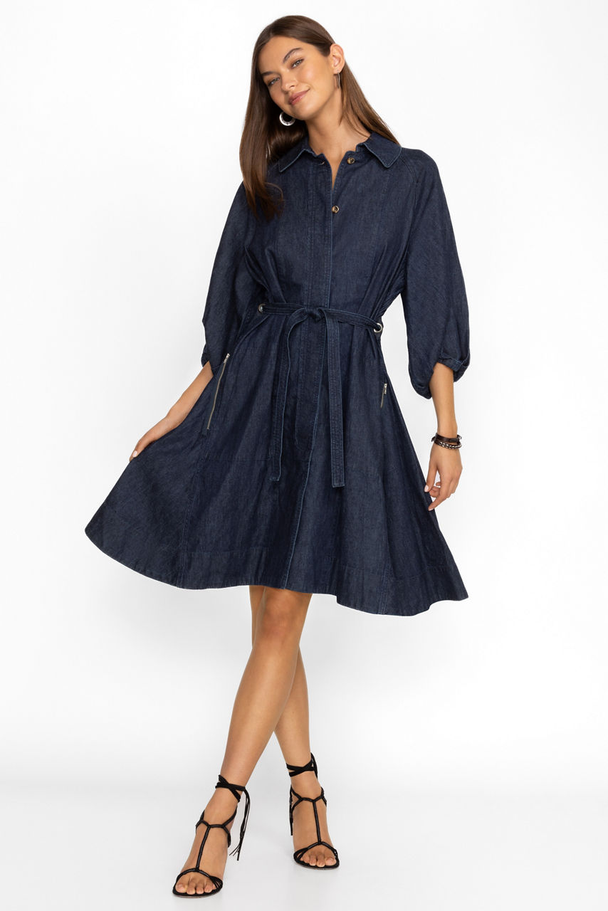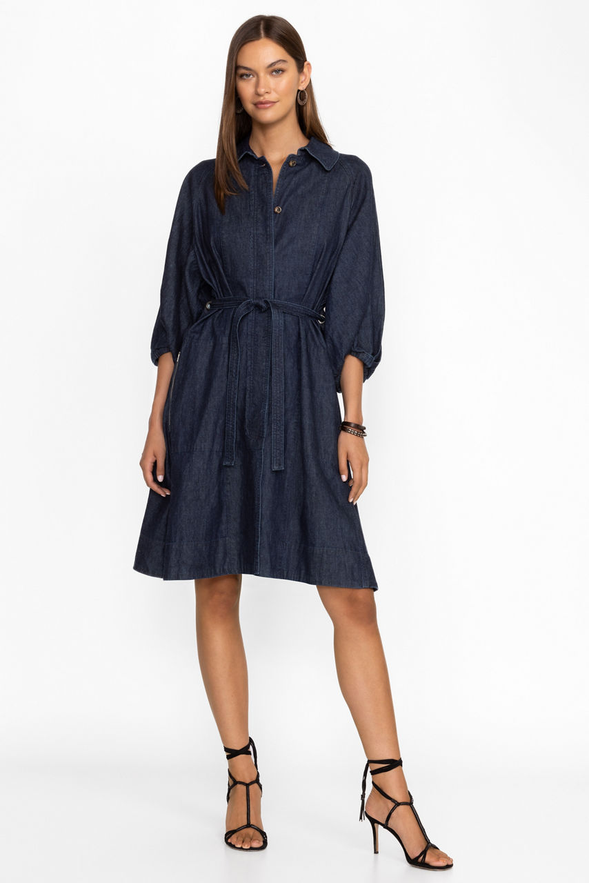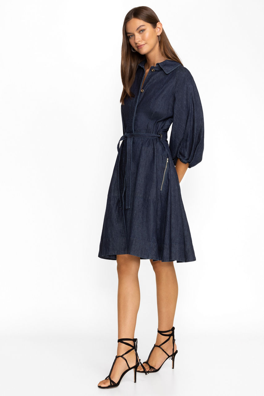 The Montaigne Denim Dress combines comfort and style in a modern A-line silhouette. Crafted from a blend of cotton and hemp, this dress features a button-down front and a tie at the waist for a flattering fit. The elasticized sleeve cuffs add a touch of elegance, elevating your look no matter the occasion.