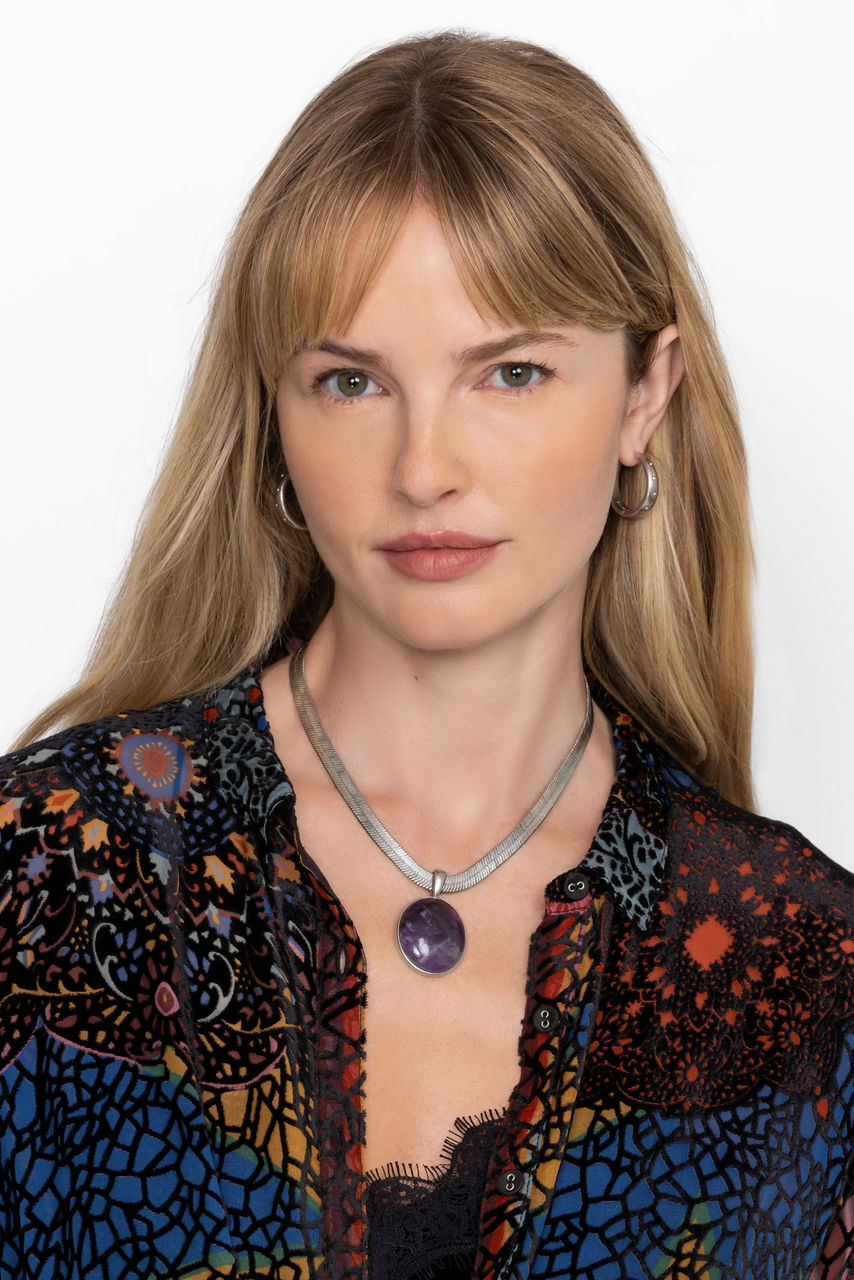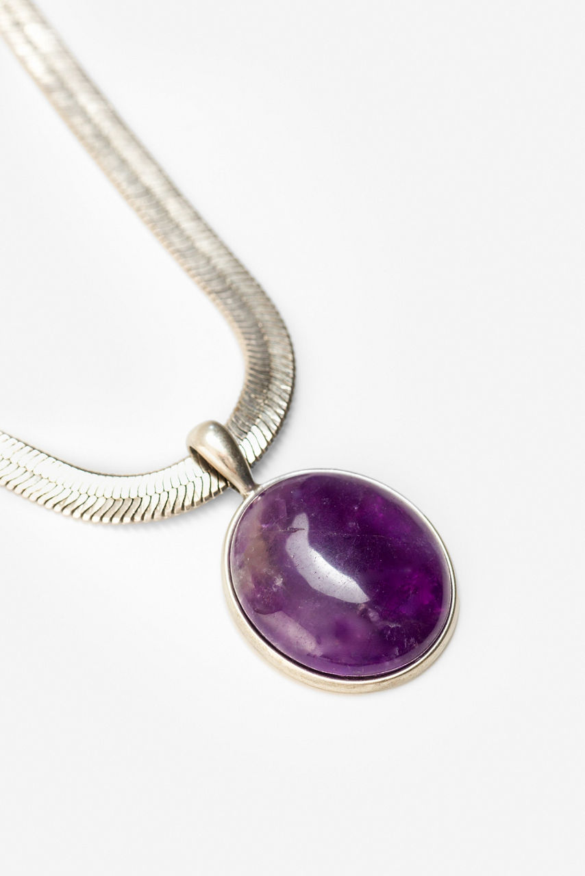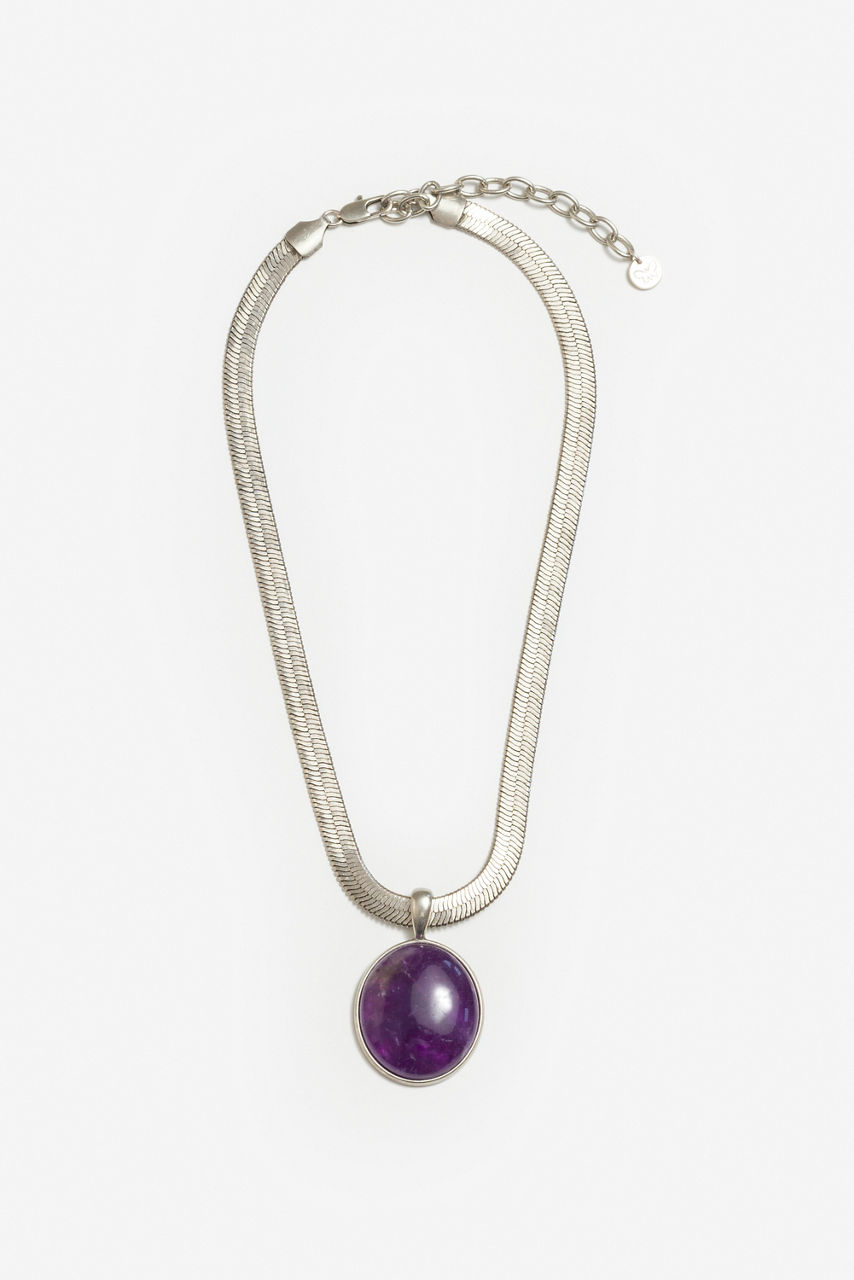 Creating a statement in elegance, the Moon Phase Necklace is a bold, eye-catching jewelry piece. Featuring a wide flat snake chain crafted from 100% silver-tone brass with a lobster clasp and chain extender, this unique necklace is finished with a large round amethyst suspended at its center. Pair with a V-neck top and other silver-tone jewelry pieces to allow this necklace to shine.