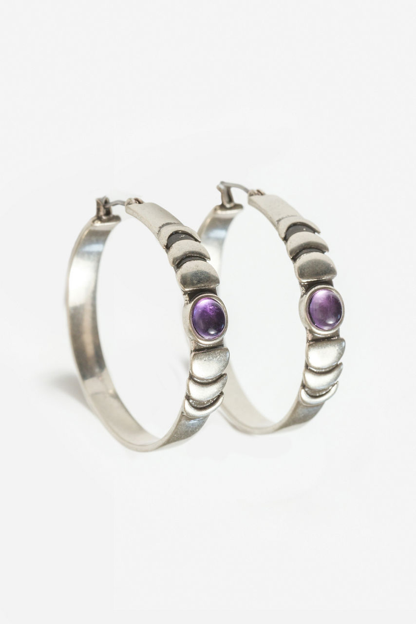 Crafted from sleek silver-tone brass, the Moon Phase Single Hoop Earrings are adorned with glittering celestial bodies. Featuring a single hoop intricately detailed with moon phase iconography, these earrings are finished with a brilliant amethyst stone at the center for a hint of sophistication. Pair with a necklace from the Moon Phase Collection and wear with a casual outfit for the perfect finishing touch.