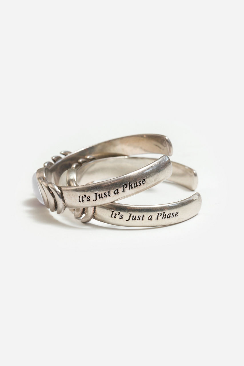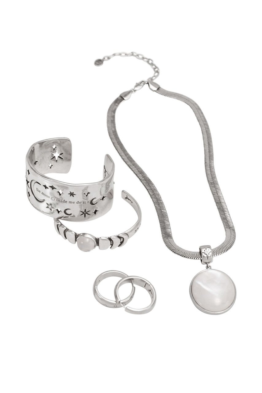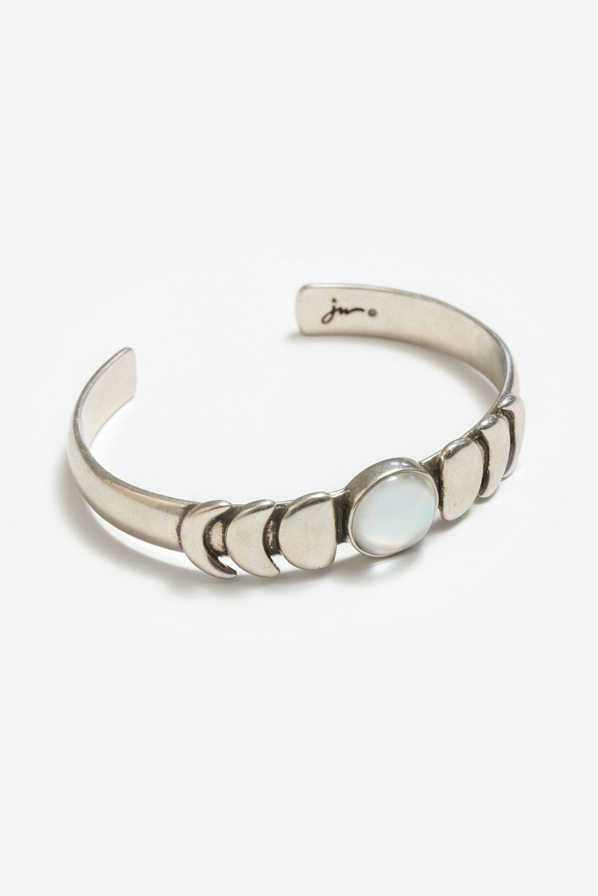 Depicting the moon's many phases, the Moon Phase Single Pearl Bracelet is crafted in silver-tone brass. Featuring a wide cuff with a Mother-of-Pearl effect epoxy stone at its center, this bracelet is finished with the waxing and waning moon phases at each side of the stone. Pair with the Moon Phase Pearl Necklace and Single Hoop Earrings for a perfectly coordinated look.