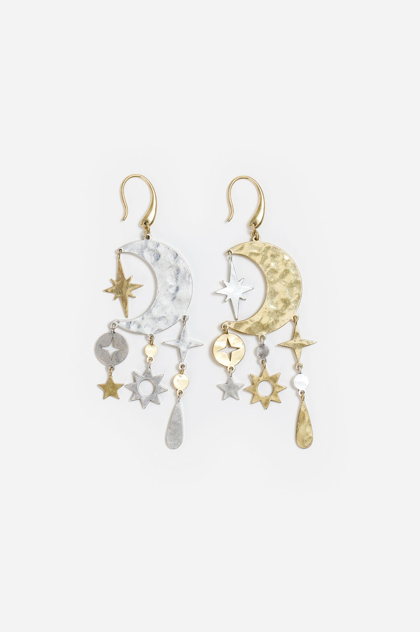 Expressing the beauty of the night sky, the Moondance Chandelier Earrings offer a delicate balance of both moon and stars. Crafted from 100% brass these earrings provide a carefully created mobile of stars intricately placed around a stunning crescent moon. Pair with the Moondance Pendant Necklace to add the perfect bit of shine to your evening look.