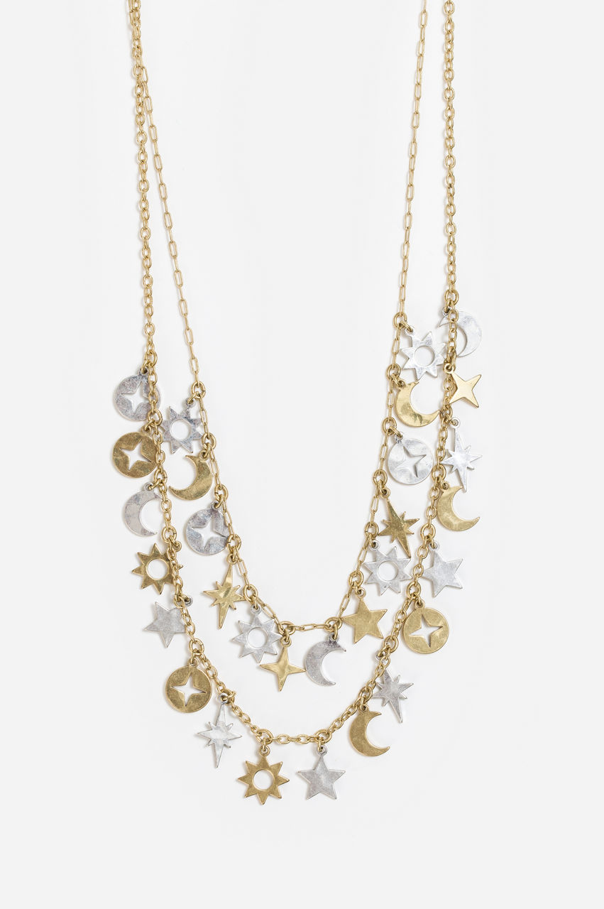 Offering an ornate depiction of shimmering celestial bodies, the Moondance Charm Necklace adds the perfect amount of sparkle to your evening look. Crafted from 100% brass and arranged in two striking strands, this beautiful necklace shines in a combination of gold and silver tones. Pair with a V-neck blouse and classic trousers for dinner out.