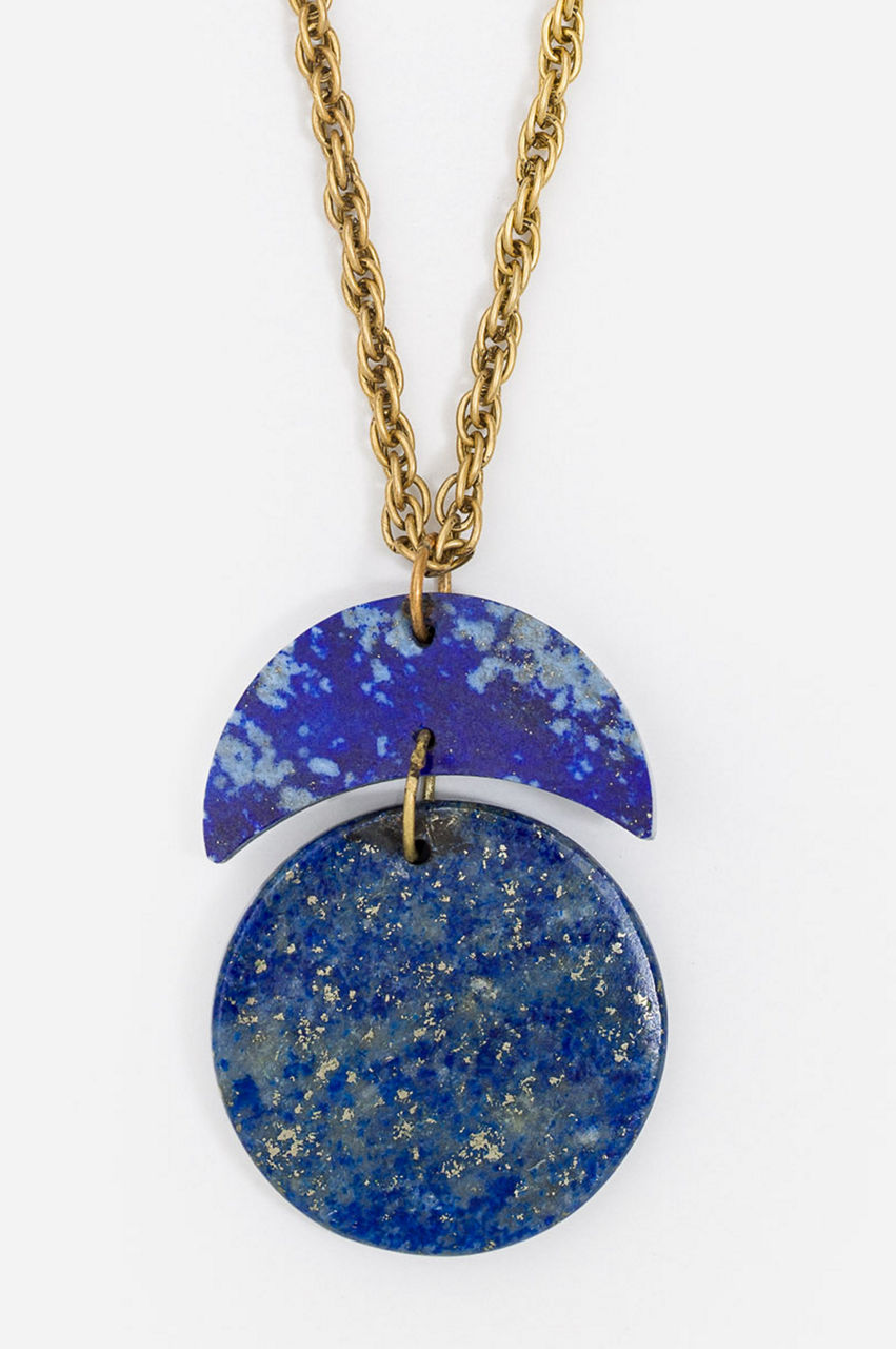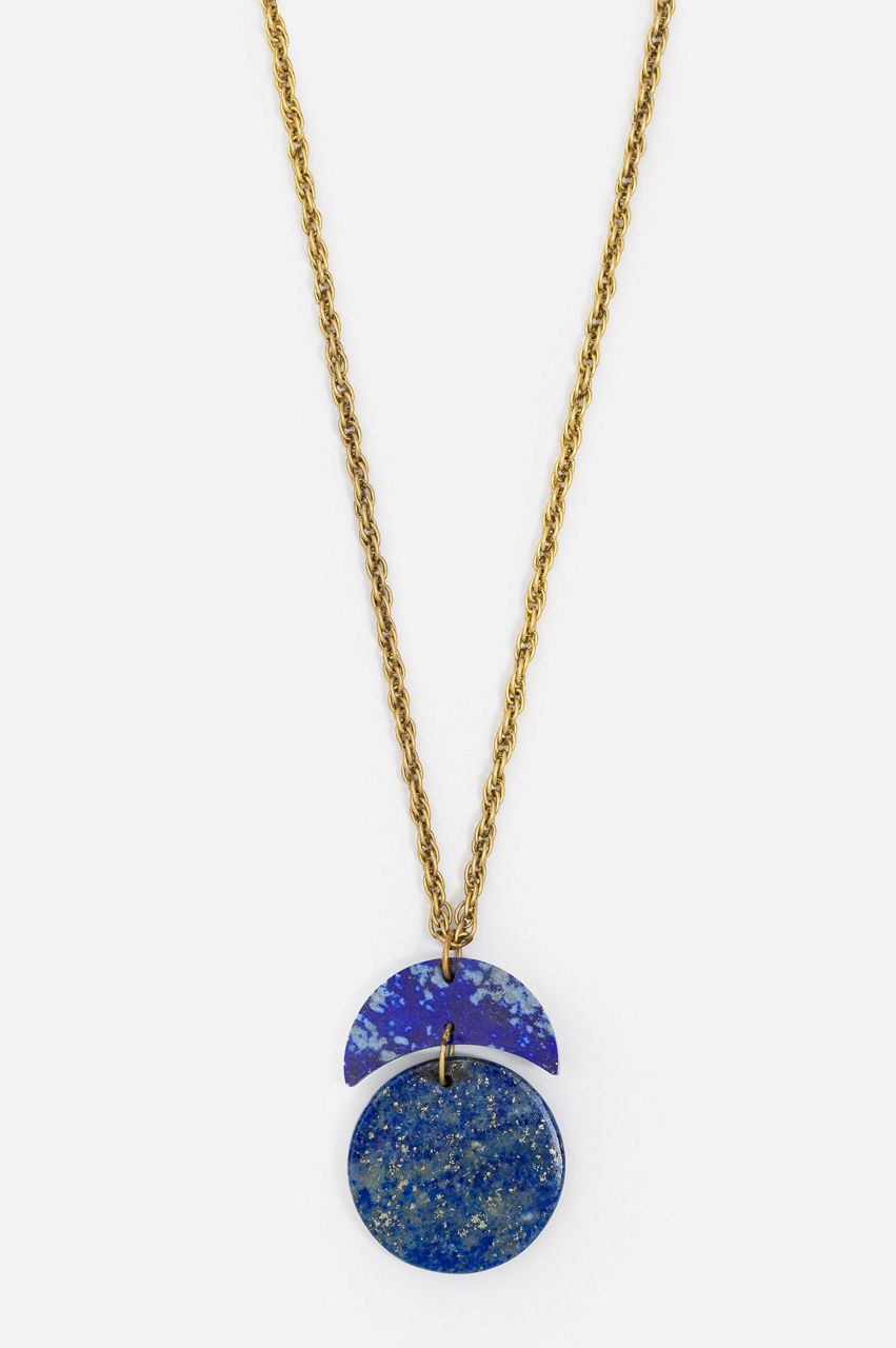 Toying with shapes, the Moon Stack Pendant filters a classic design through a contemporary lens. This necklace is crafted from a mix of metal and stone and features a gold-tone metal chain, a blue circular pendant with gold flecking, and an additional crescent-shaped pendant suspended above. Wear with V-neck blouses or dresses for a bold look.