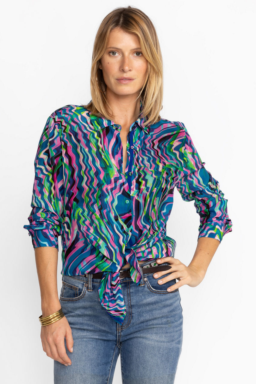 Adding a vivacious display of color to your wardrobe, the Moonwave Button Down Shirt features a mesmerizing unforgettable pattern. Crafted from 100% luxurious silk and adorned with fabric covered button this lovely blouse adds life to a classic silhouette. Pair with black slacks and kitten heels for a fresh workday look.