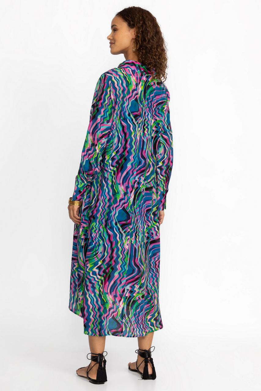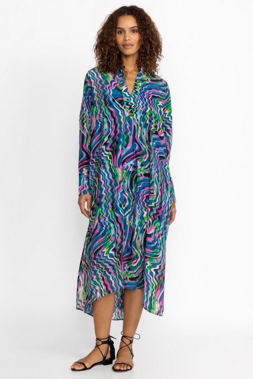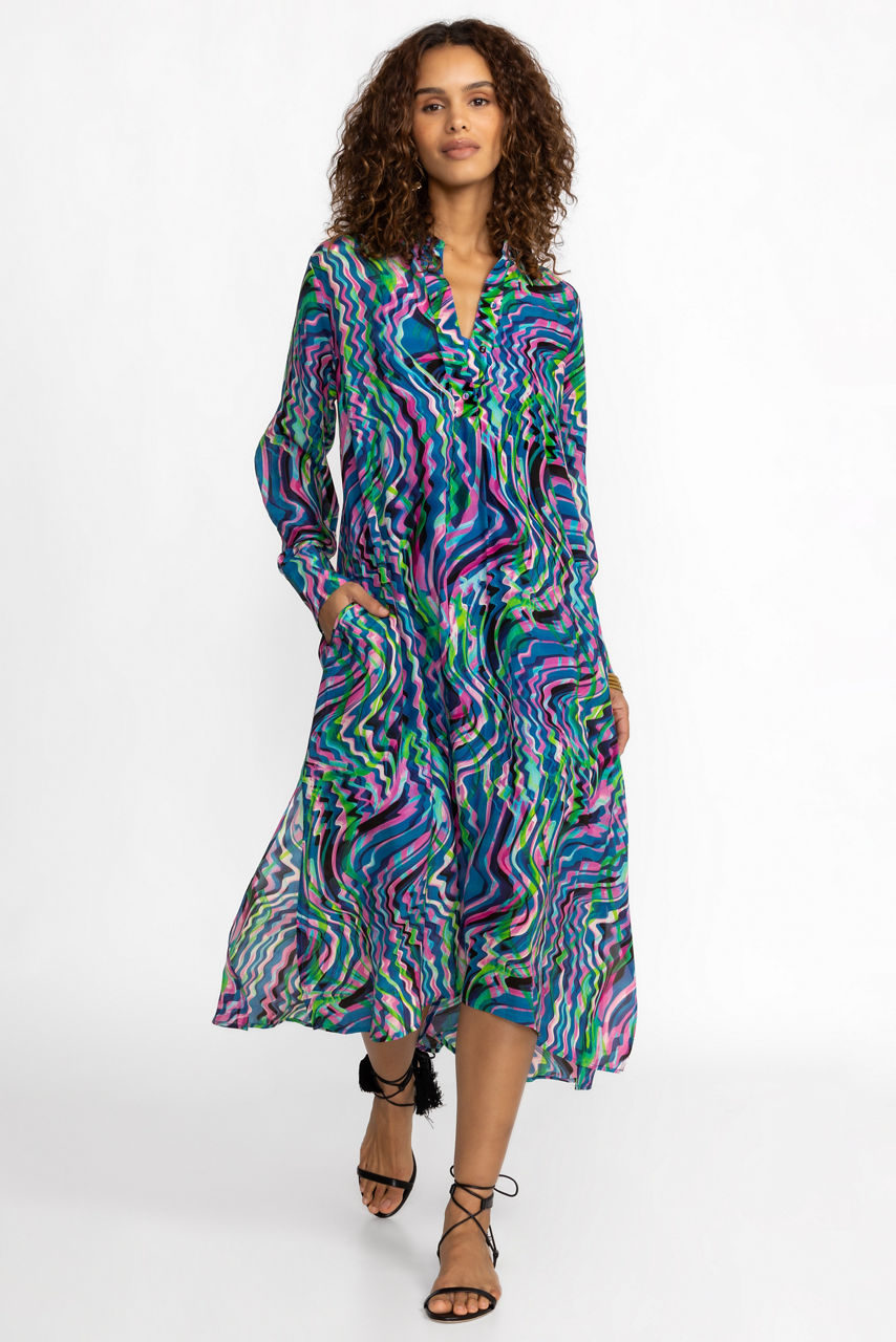 Offering a delightful kaleidoscope of color and pattern, the Moonwave Henley Dress is truly a vision. Crafted from 100% luxe silk and featuring a separate slip, this beautiful dress offers pockets and delicate fabric covered buttons. Pair with casual flats and glittering jewelry for a polished vacation-ready look.