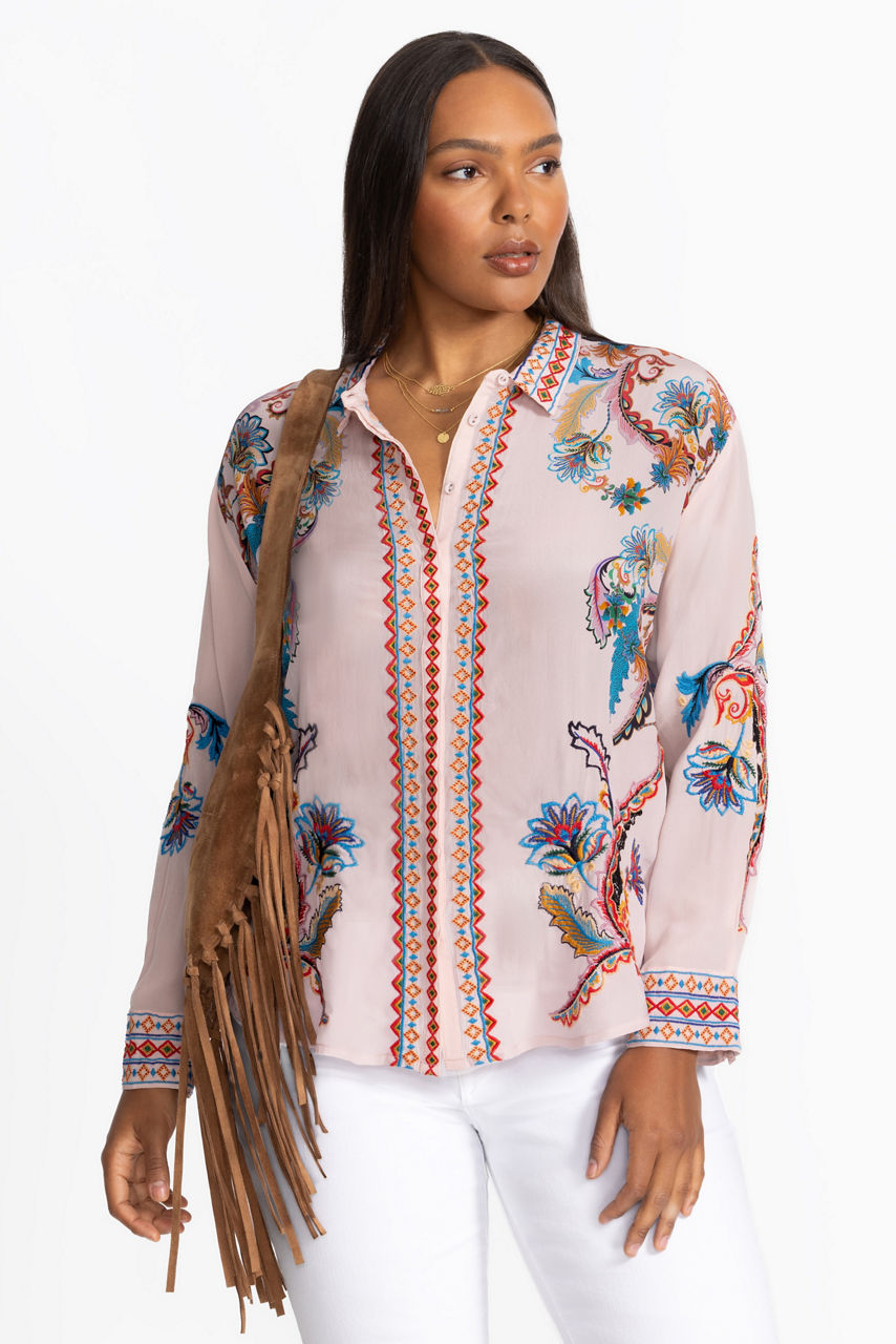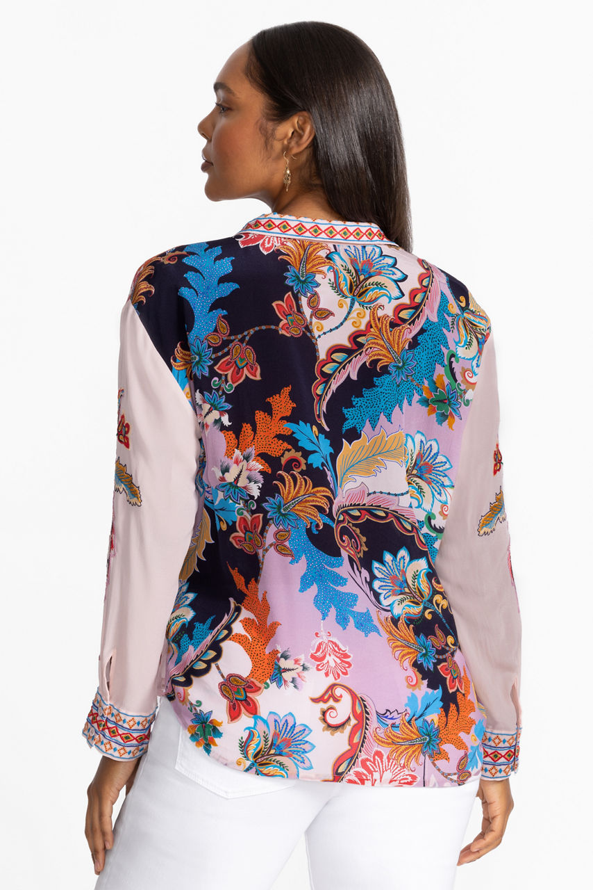 Crafted from 100% luxurious silk, the Morelia Shirt offers a new twist on a classic button-down. Designed with a traditional collared button-front and elegantly embellished with intricate embroidered detailing, this shirt is finished with a contrasting back panel and a gently curved hemline. Pair with flowing wide leg trousers and glittering gold jewelry for a unique work ensemble.