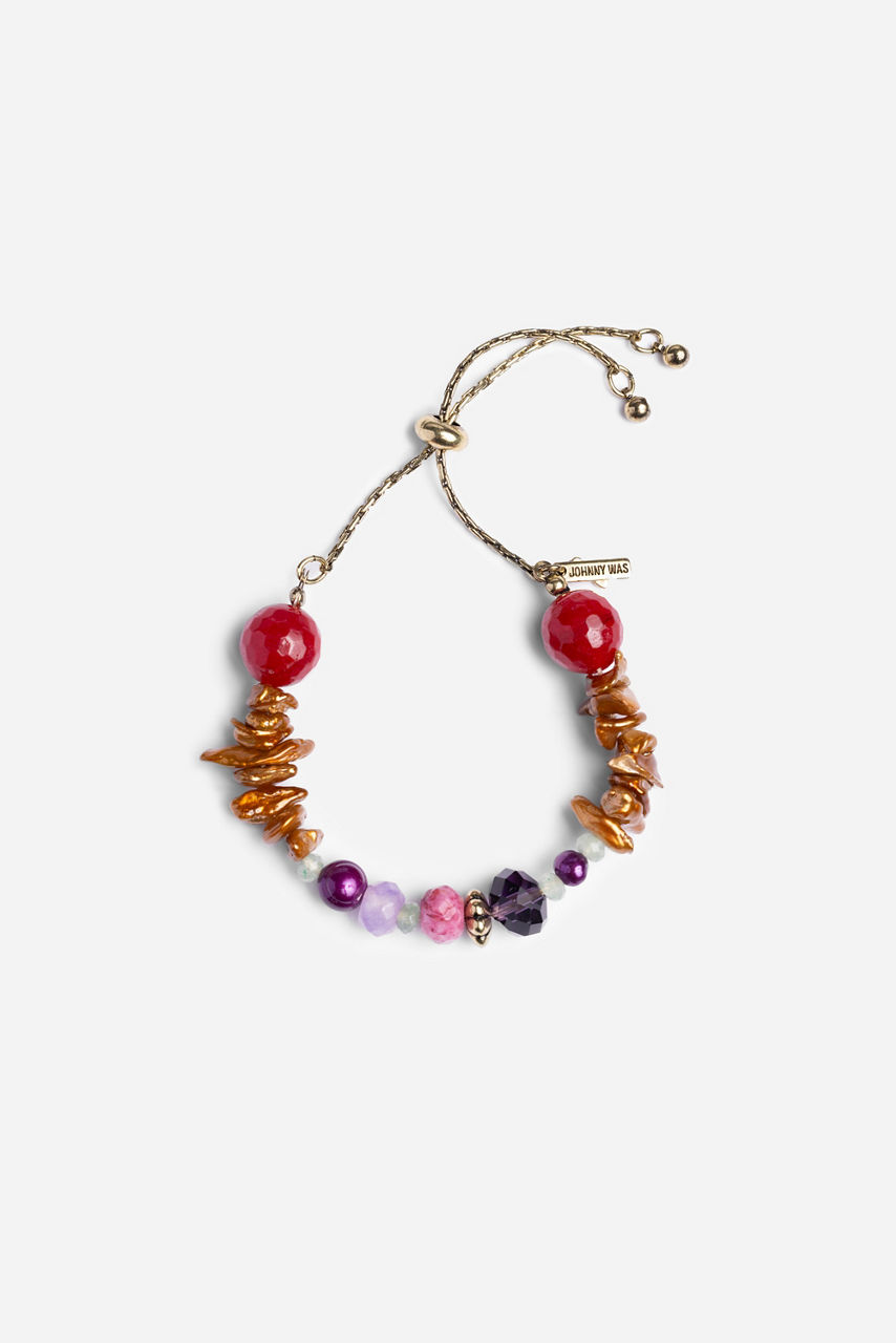 The Multi-Mix Beaded Stone Bracelet features an artful mix of natural stone beads in varying sizes and colors, making each piece truly one of a kind. The stones are arranged in a balanced line across the front, punctuated by metal accents that add a touch of shine and the bracelet is finished with a convenient slide for an adjustable fit. Perfect for stacking or wearing solo, this bracelet brings a refined feel to any look.