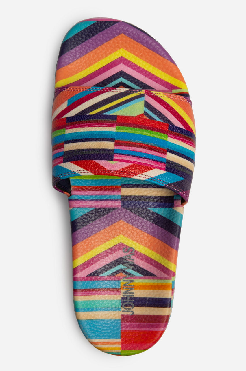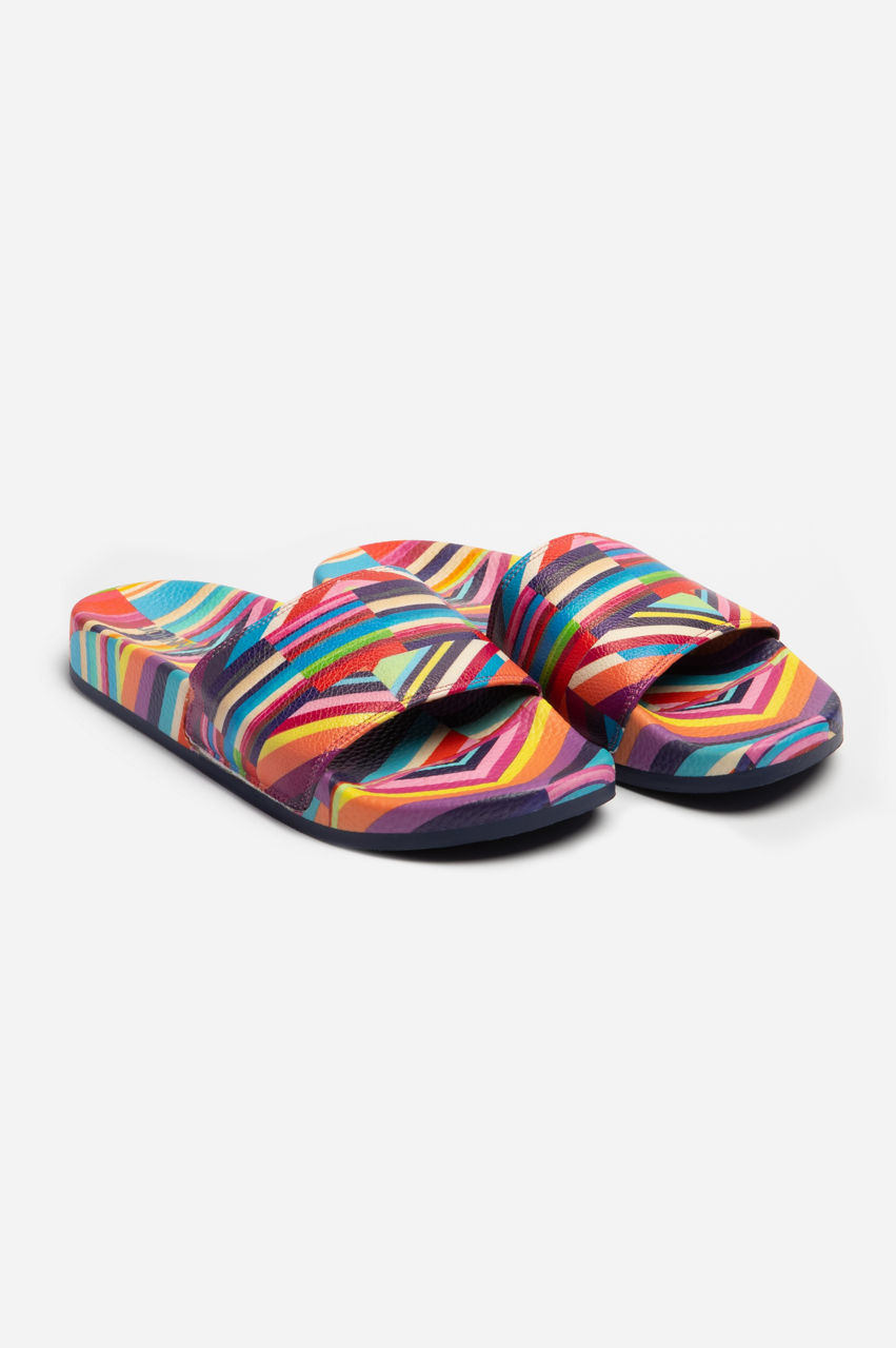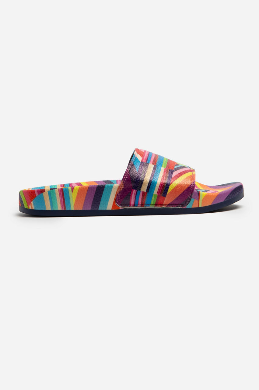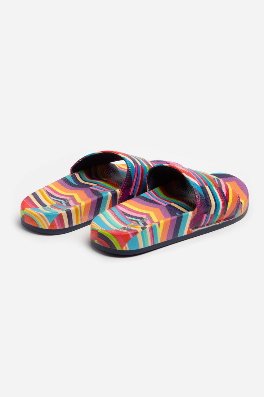 A rainbow of vibrant colors, the Multi Stripe Pool Slides bring an eclectic twist to your vacation repertoire. These slip-on sandals are made from durable and easy-to-clean rubber complete with a strap across the front and an open round toe. Defined with a graphic stripe pattern, these slides a versatile daily staple for beach breaks and summer days.
