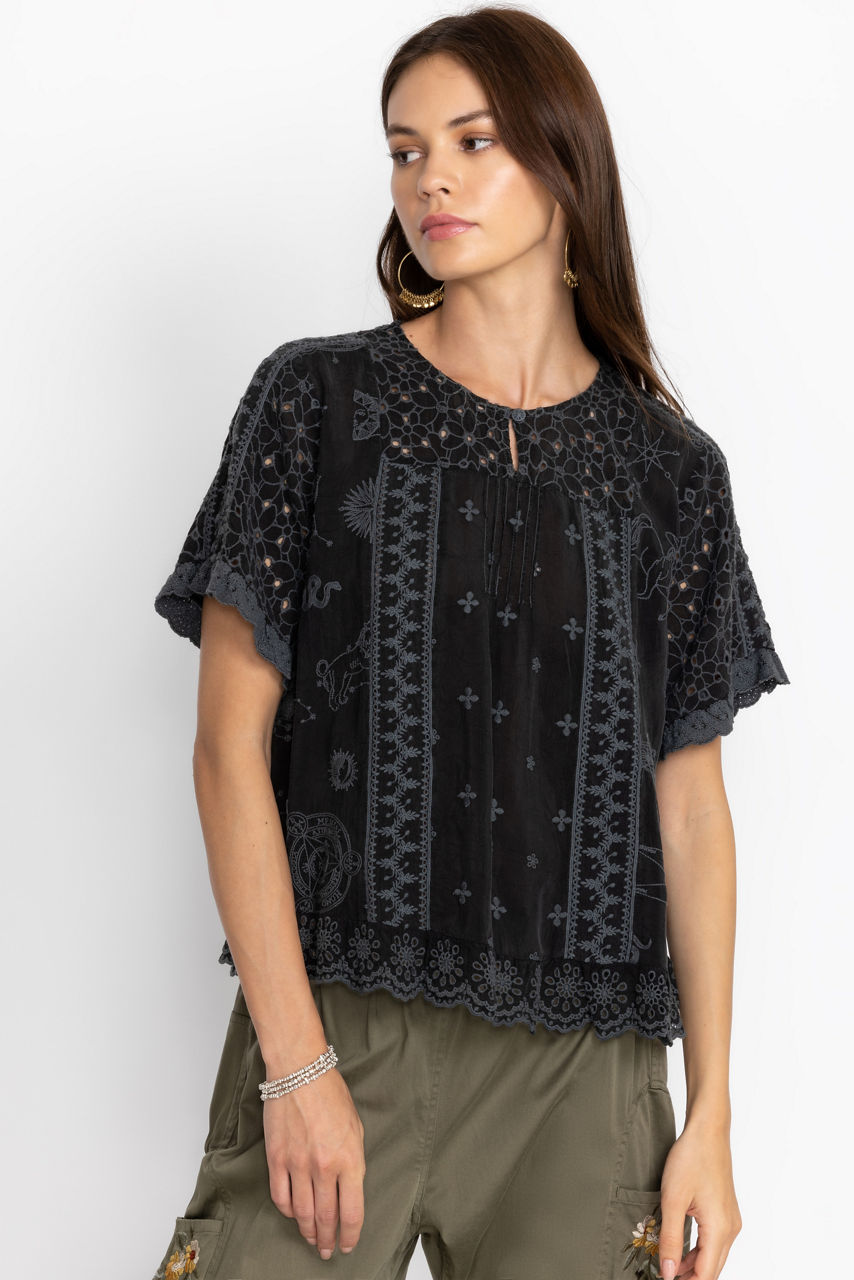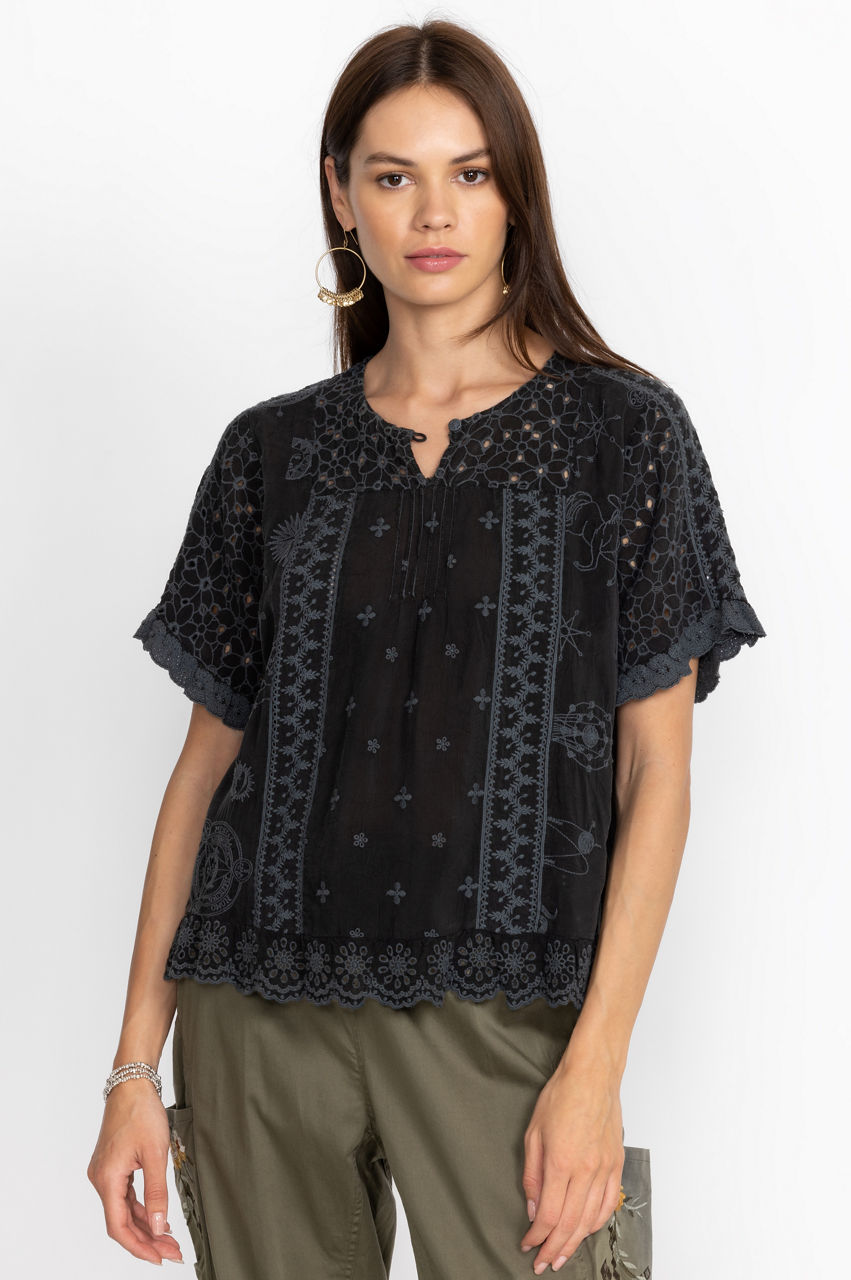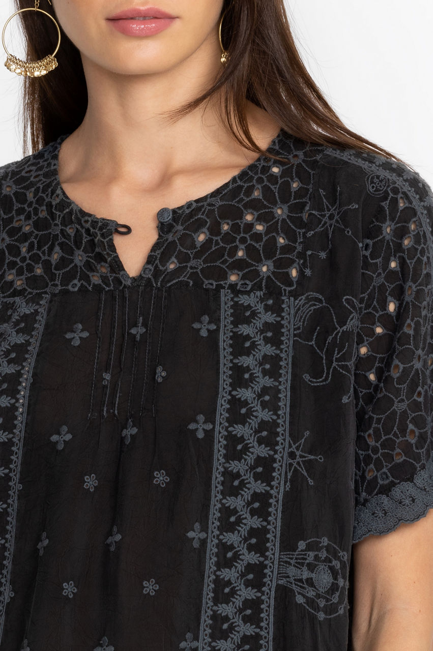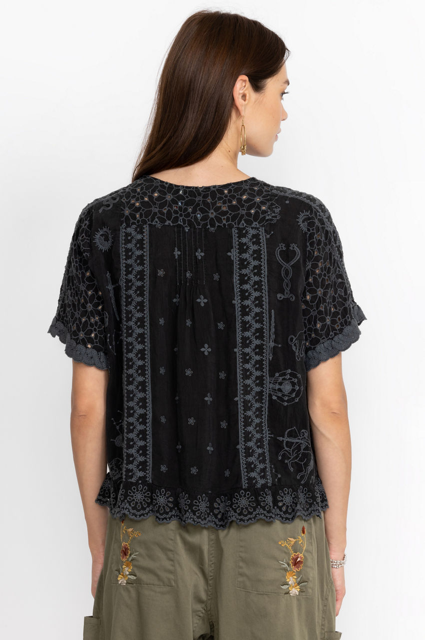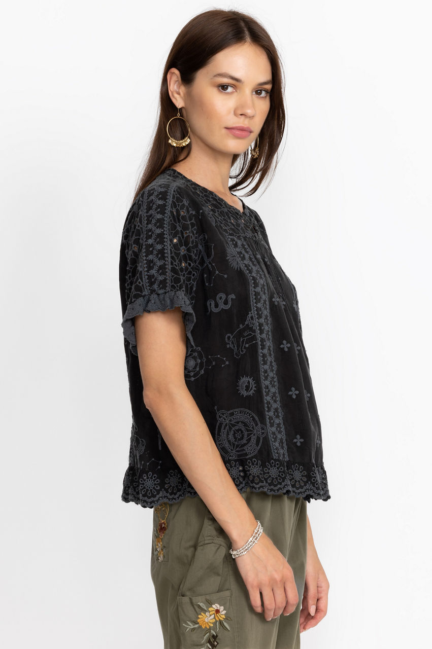 Encompassing a free-spirited aesthetic, the Mystic Compass Blouse is a versatile addition to your daytime warm-weather wardrobe. Designed from a lightweight fabric, this blouse boasts a round neck, short sleeves, ruffle trims along the edges, and a subtle, tonal embroidery throughout. Keep your ensemble casual by pairing with jeans and flat sandals.