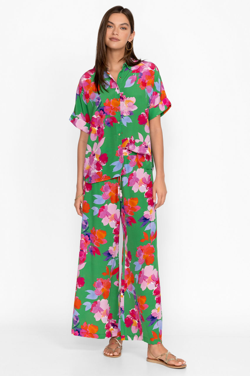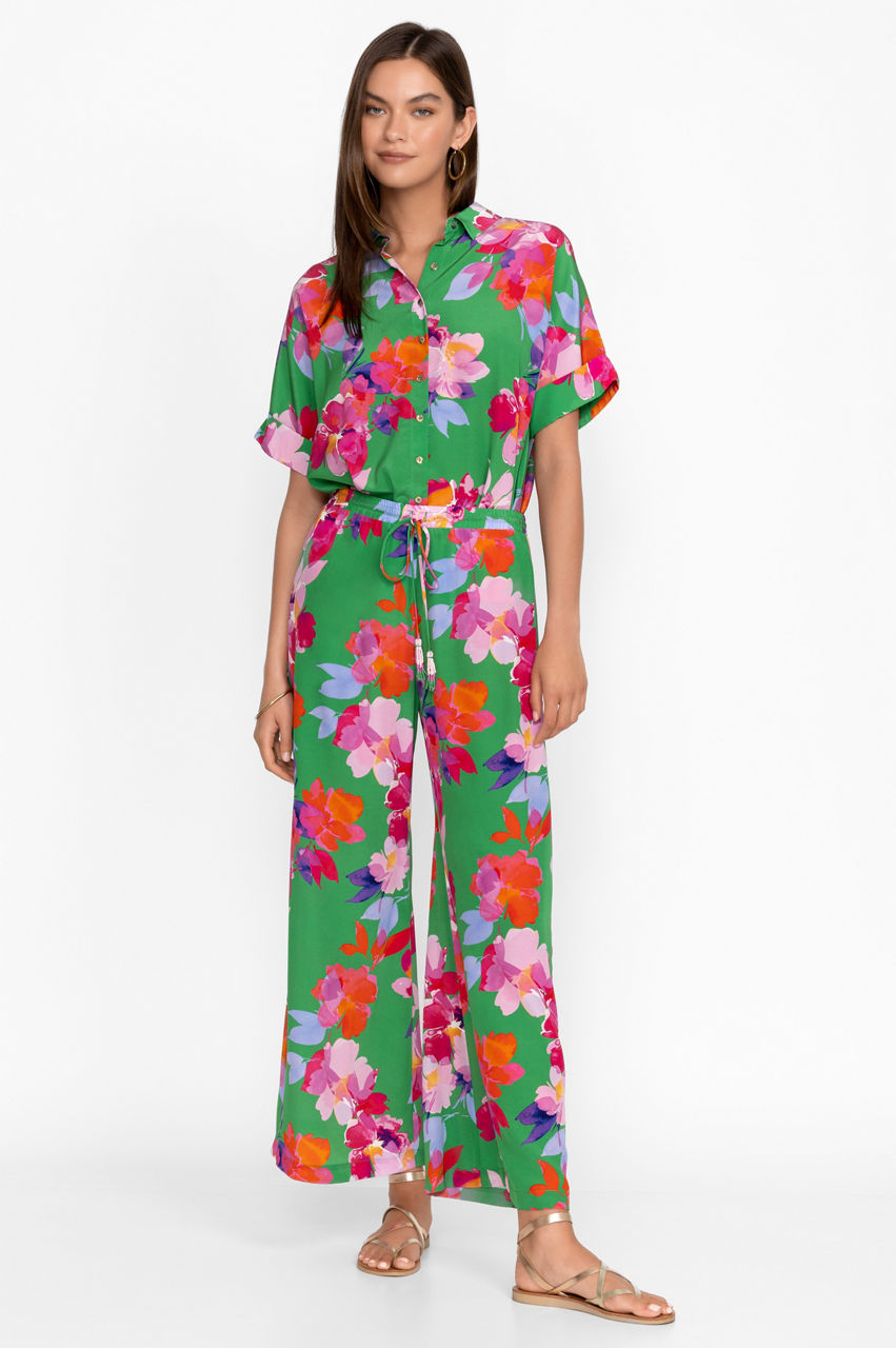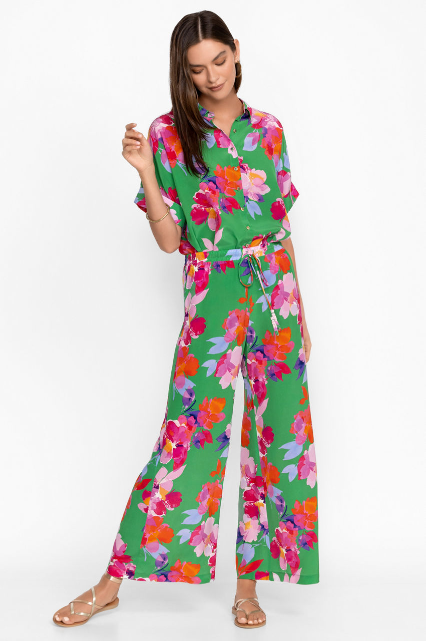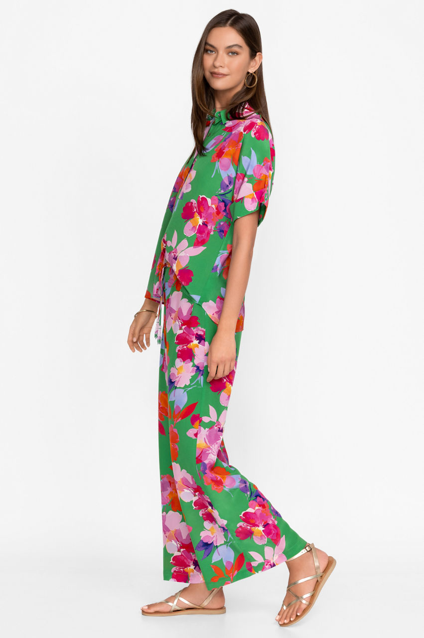 Spun from liquid-like silk, the Nadine Silk Pants conjure images of tropical landscapes and botanical gardens. Vibrant and unique, these breezy pants adopt a green colorway and feature a comfortable elastic waistband, a tie front with tassels for an opulent effect, and large, open blooms in pink and red tones. Style these pants with a cami top and clutch for a modern take on low-key glamour.