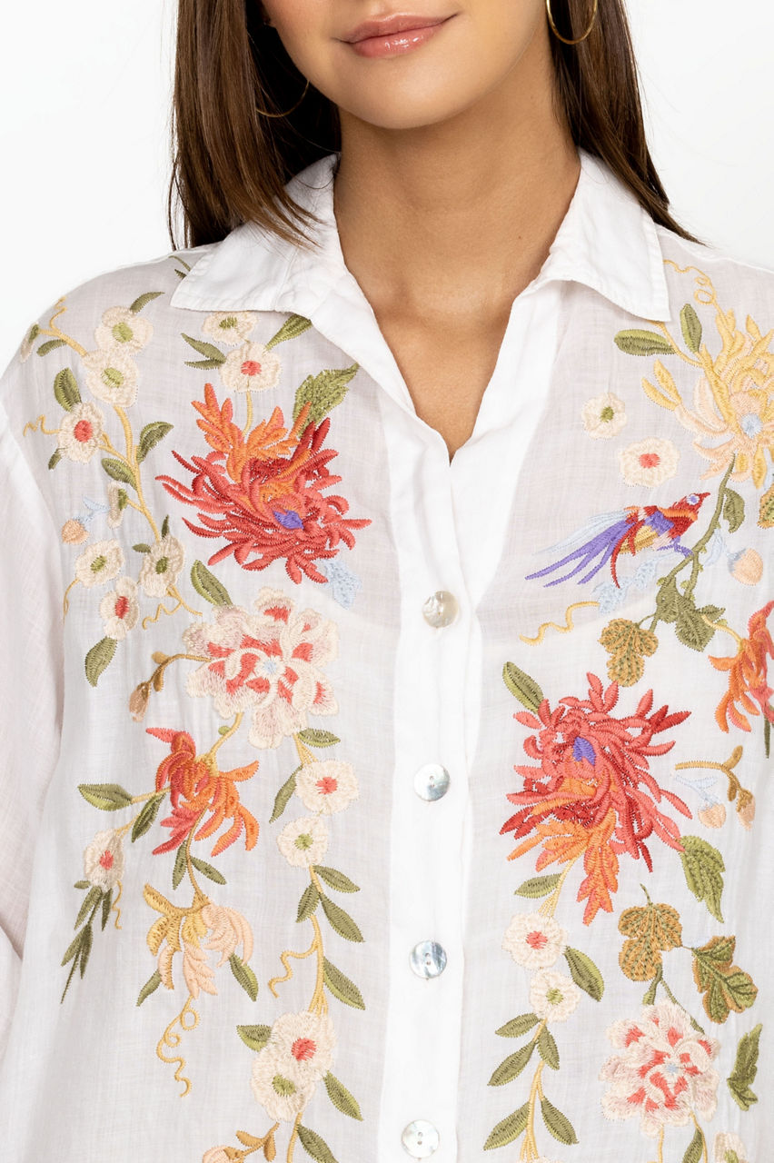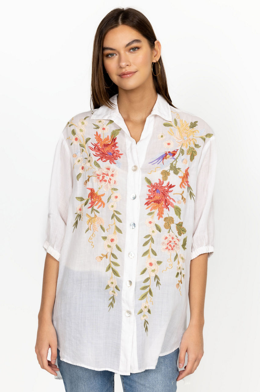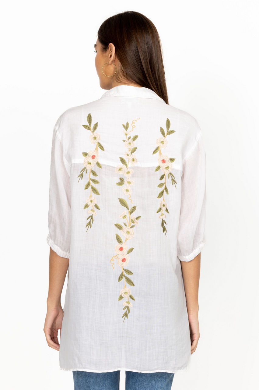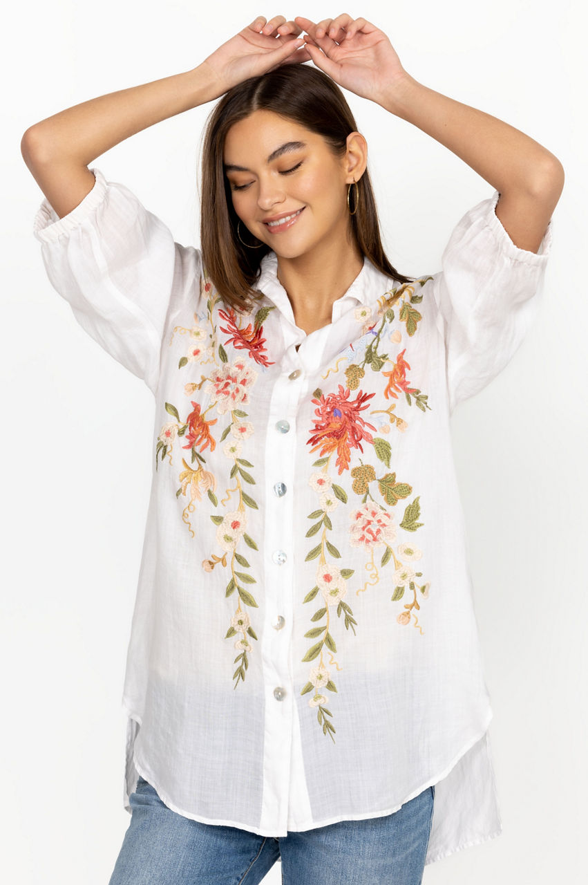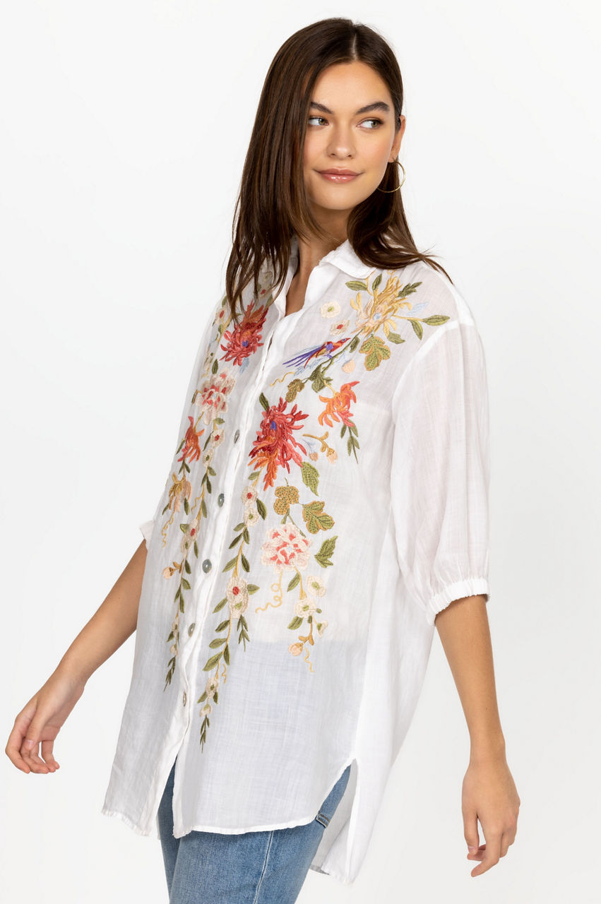 Understated yet striking, the Nalina Oversized Weekend Tunic is sure to become a go-to style on off-duty days. This tunic is crafted from ramie and adopts a comfortable oversized silhouette with a collar, three-quarter length sleeves, and a front button closure. Finished with a colorful flower-dotted placement embroidery, this tunic can be layered over pants or styled with a bikini on your next beach vacation.