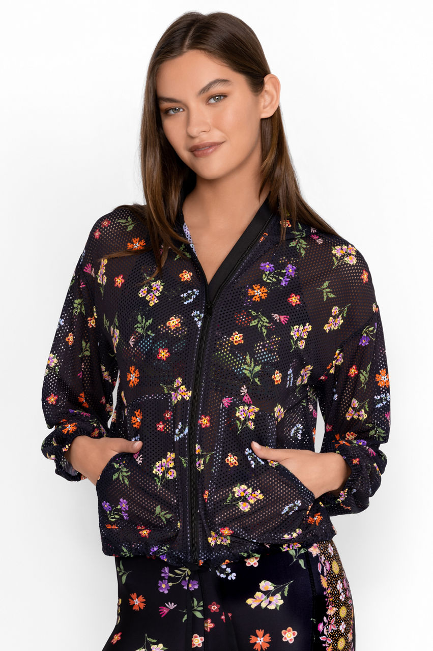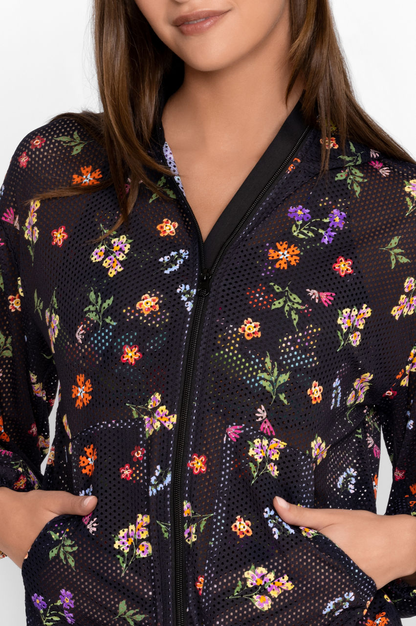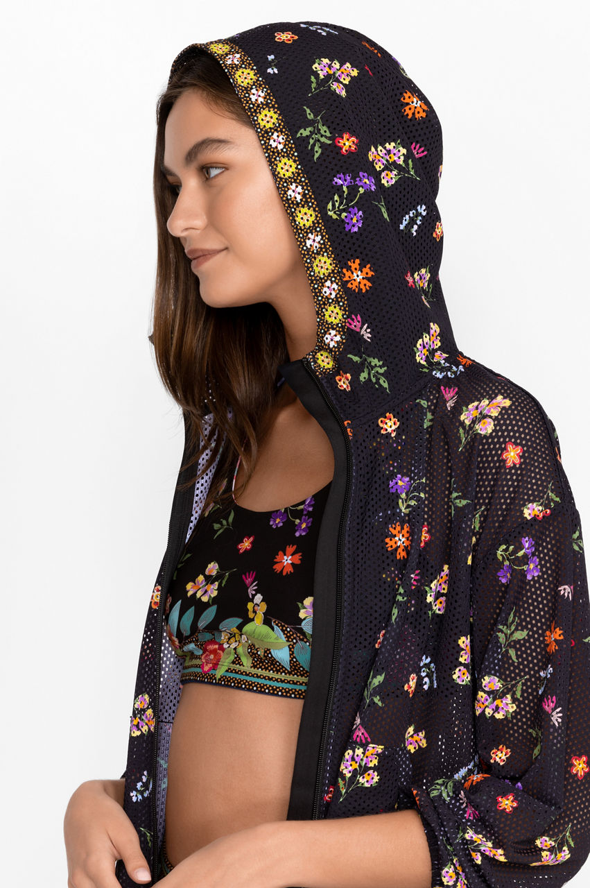A stylish choice for outdoor activities, the Nani Patch Pocket Mesh Jacket marries functional sports details with an elegant feel. This jacket is made from a breathable mesh fabric with added stretch and features a hood, long sleeves, a front zip, and a drawcord at the hem to define the silhouette. Finished with a fresh floral arrangement, this jacket can be paired with leggings or shorts on warmer days.