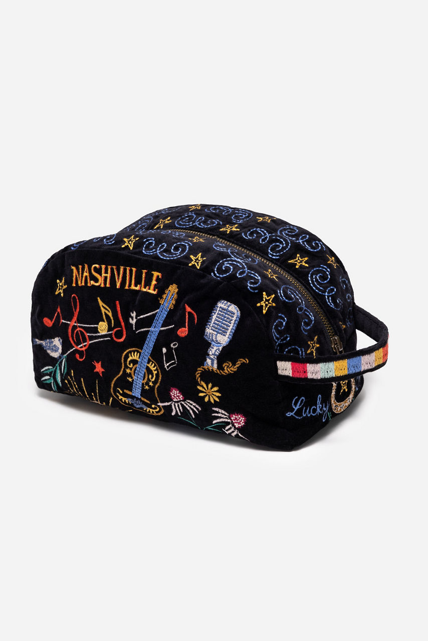 Crafted from 100% cotton, the Nashville Makeup Bag is stylish and durable. Intricately embroidered with the iconography of the city, this spacious bag features full lining and a zip-around closure and is finished with a wrist strap for easy carrying. Add to your daily tote, or toss in your travel carry-on for easy access to all of your necessities.