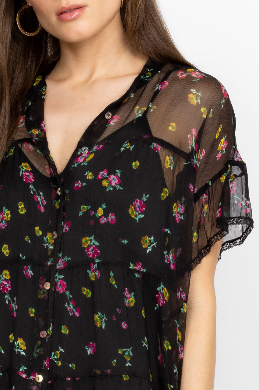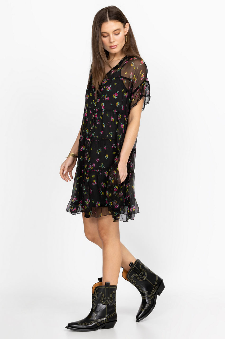 Playfully elegant, the Natalia Tiered Mini Dress embodies the joys of warmer weather. Crafted from luxe silk chiffon, this dress falls to a mini length and is characterized with a rich floral pattern in saturated hues and tiered construction for a lively feel. Finished with a separate slip and short sleeves, this dress can be styled with flats or dressed up with heels for a vibrant evening look.