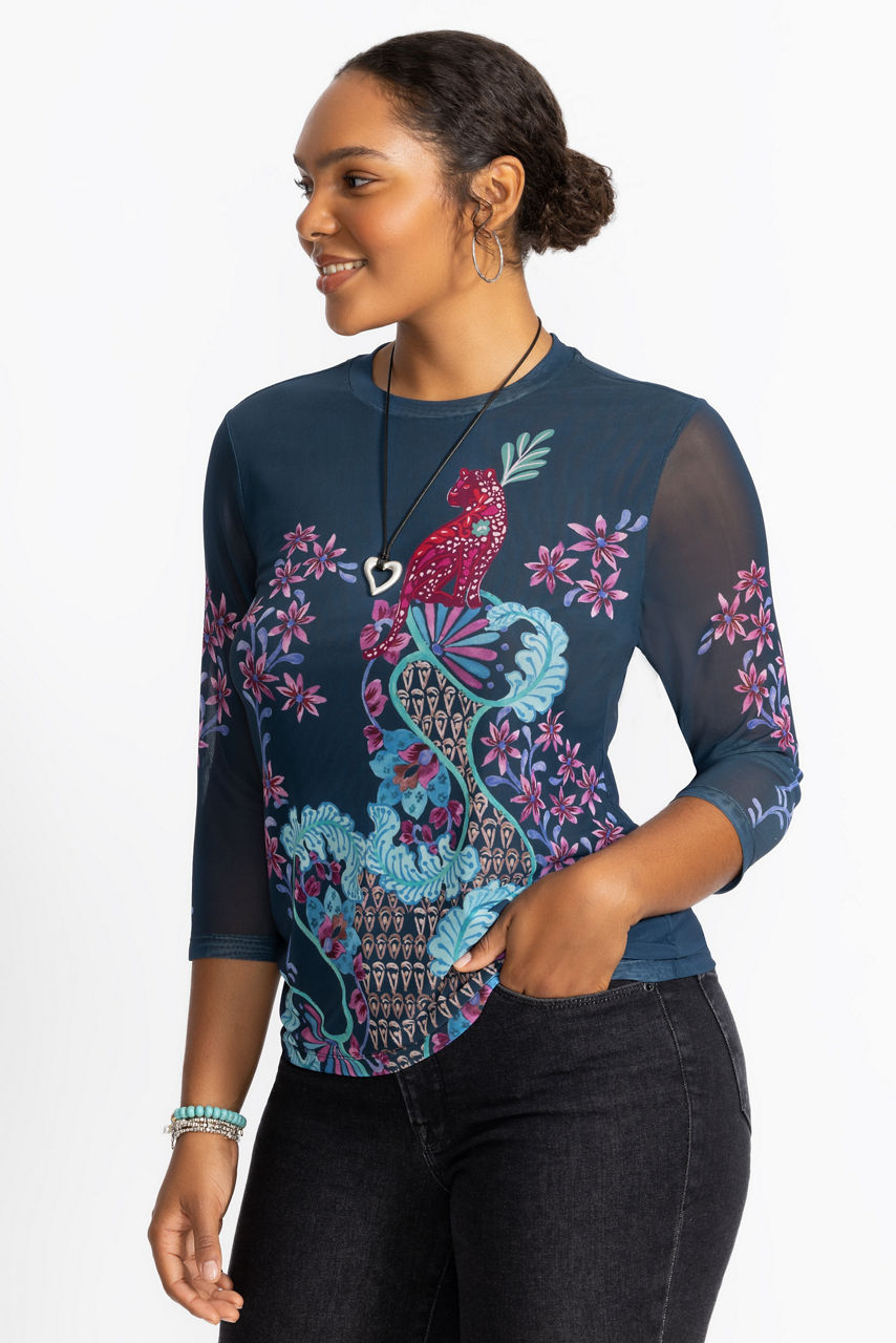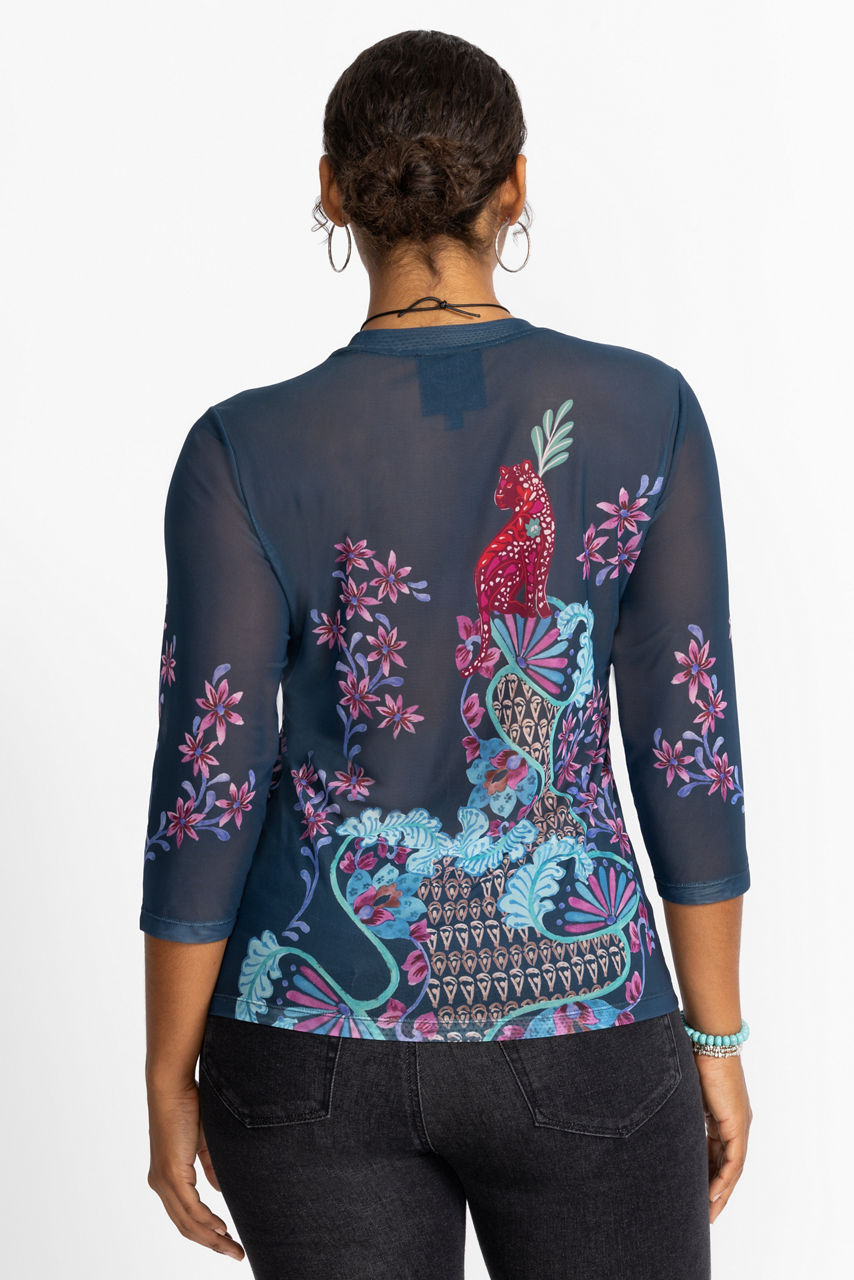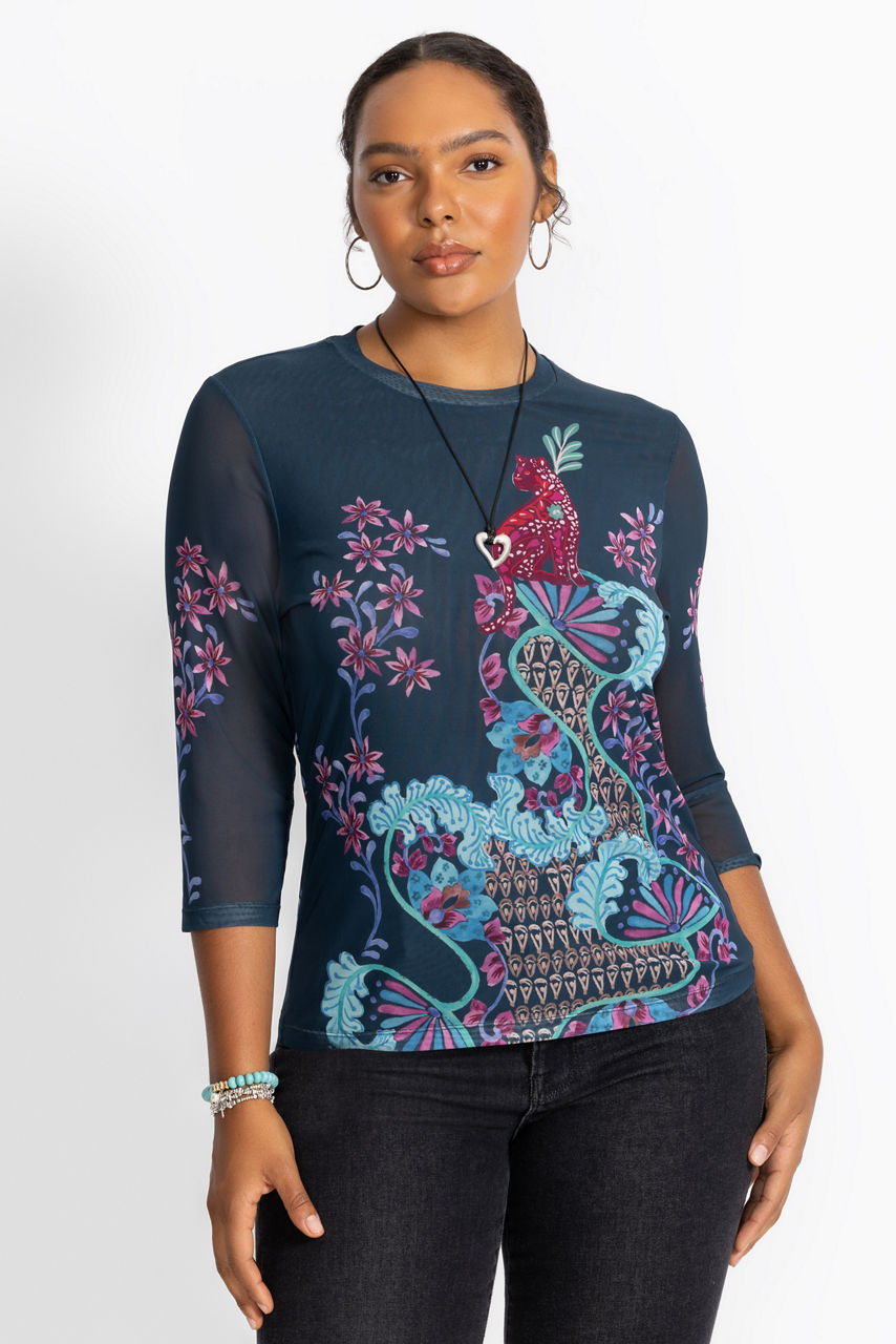 Embellished with a bold print on a rich blue backdrop, the Natalie 3/4 Mesh Tee celebrates ornate flora and fauna. Crafted from a lightweight mesh fabric with a hint of stretch, this front-lined tee is finished with a 3/4 sleeve. Pair with a structured blazer and coordinating trousers for a polished modern work look.