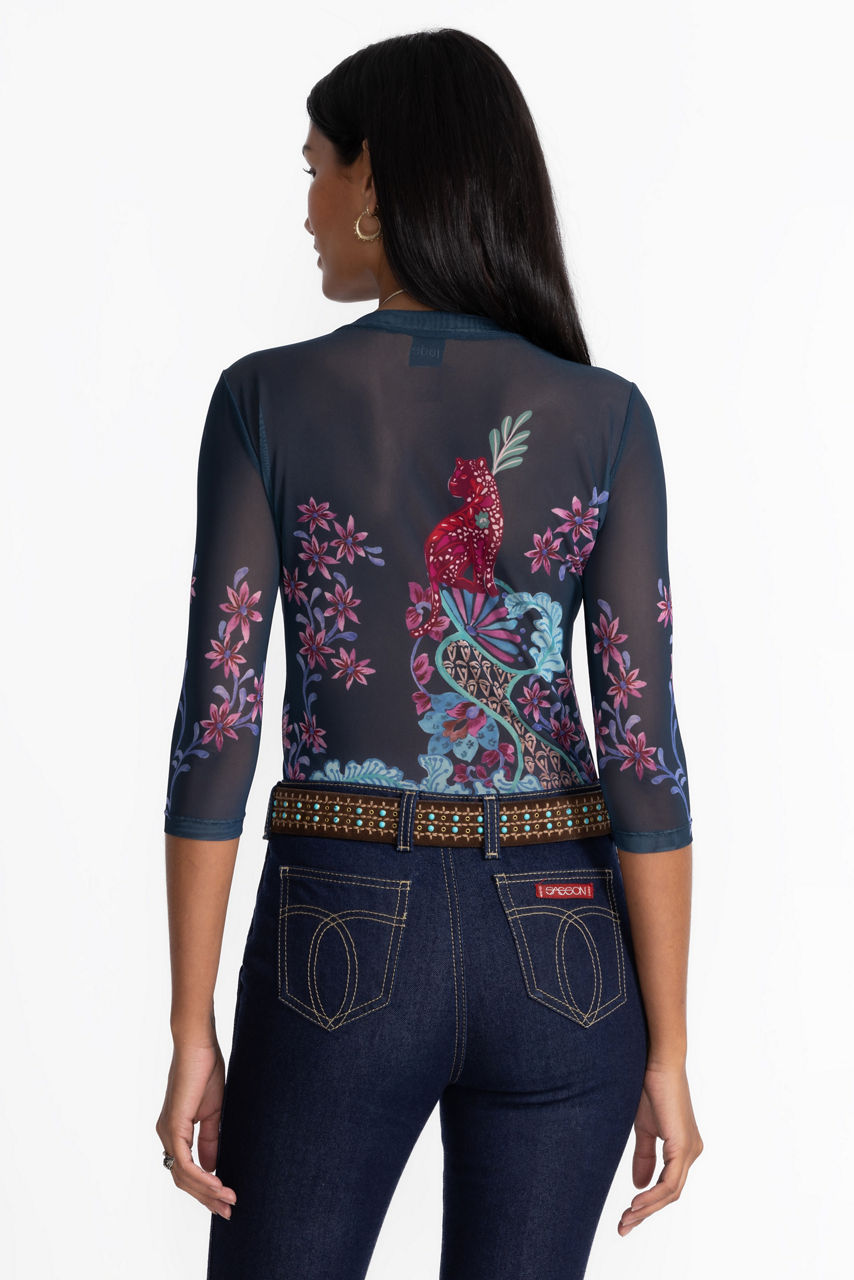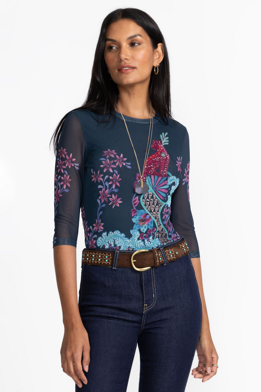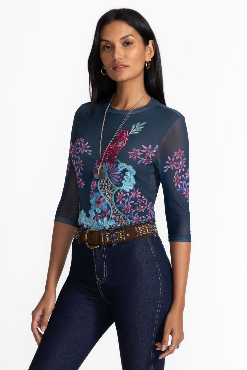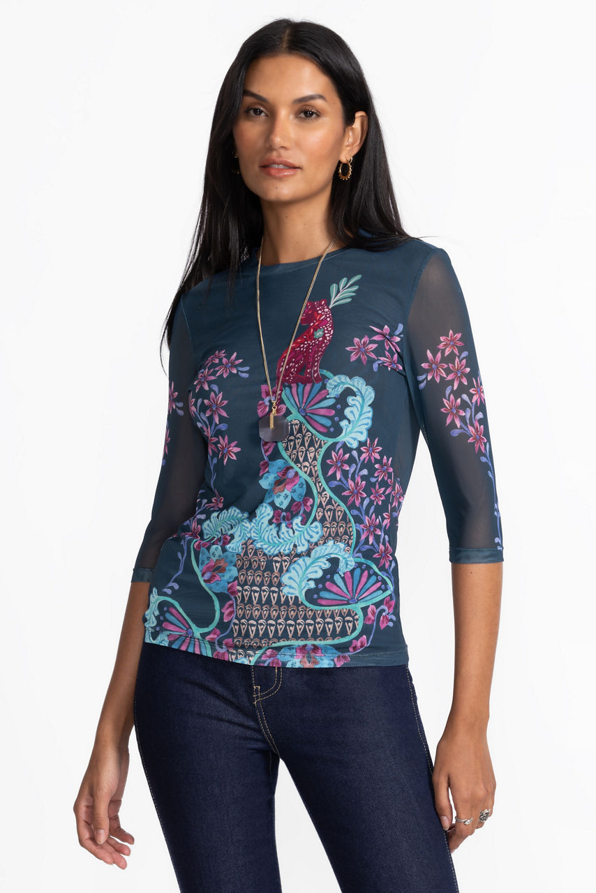 Embellished with a bold print on a rich blue backdrop, the Natalie 3/4 Mesh Tee celebrates ornate flora and fauna. Crafted from a lightweight mesh fabric with a hint of stretch, this front-lined tee is finished with a 3/4 sleeve. Pair with a structured blazer and coordinating trousers for a polished modern work look.
