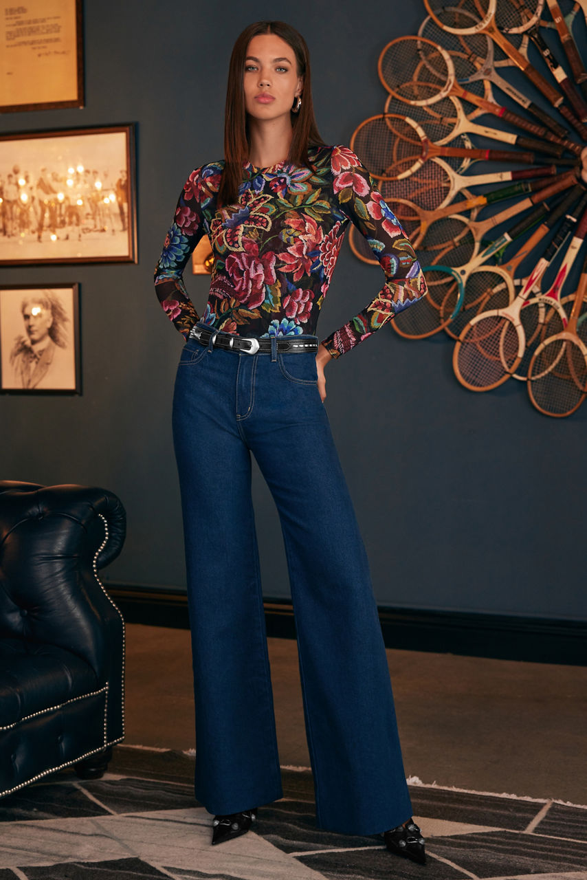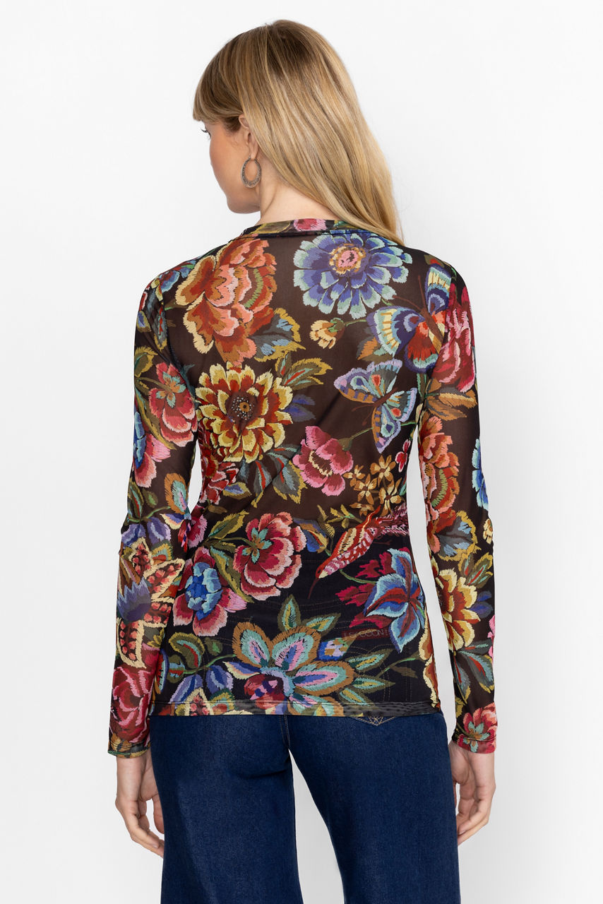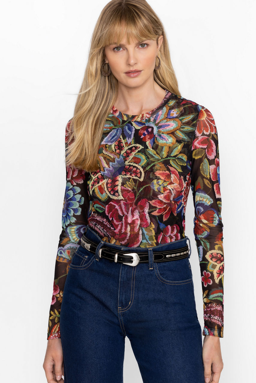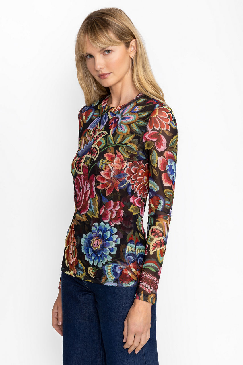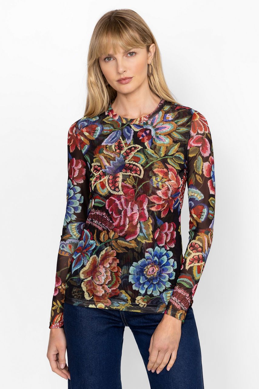 Adorned with brilliant bursts of floral blooms, the Natalie Long Sleeve Mesh Tee is crafted from a lightweight mesh with a hint of stretch. Featuring a crew neckline and long sleeves, this top offers a front panel lining for additional coverage. Pair with trendy denim and a coordinating structured blazer for a casual day at the office.