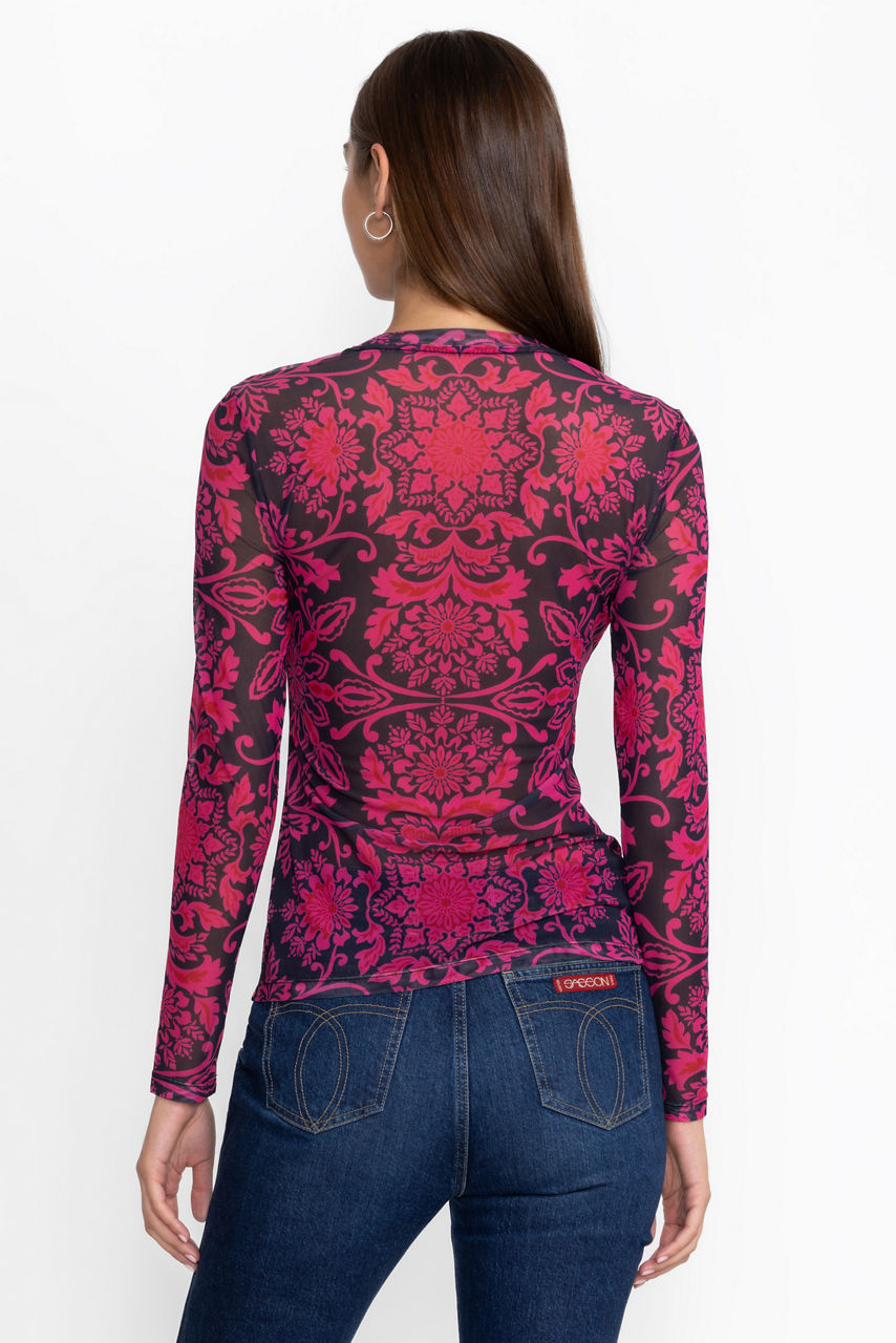 Emblazoned with a bold and colorful ornate pattern, the Natalie Long Sleeve Mesh Tee is crafted from a lightweight mesh fabric. Featuring a crew neckline and long sleeves, this fitted top is versatile and fun. Pair with black trousers and layer with a structured blazer for an eye-catching work ensemble.