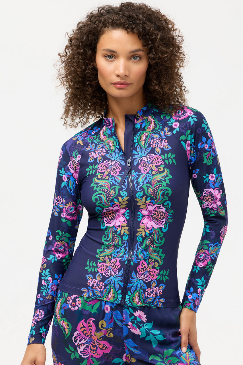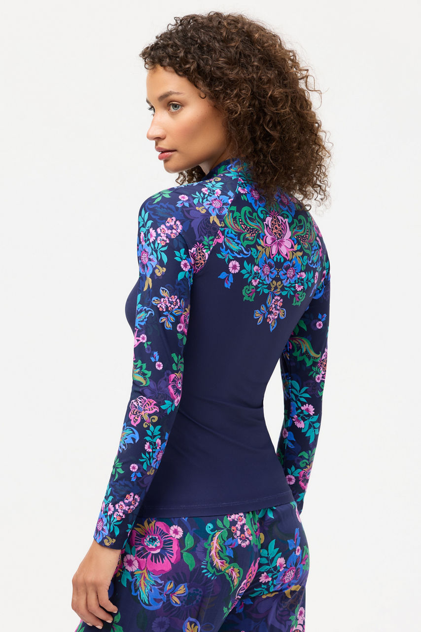 The Long Sleeve Surf Shirt pairs vibrant, ocean-inspired florals with a sleek, performance-ready silhouette. Designed to offer comfort, coverage, and a flattering fit, it moves effortlessly with you from paddle out to post-surf lounging. A front zipper adds versatility, making it easy to layer or adjust on the go.