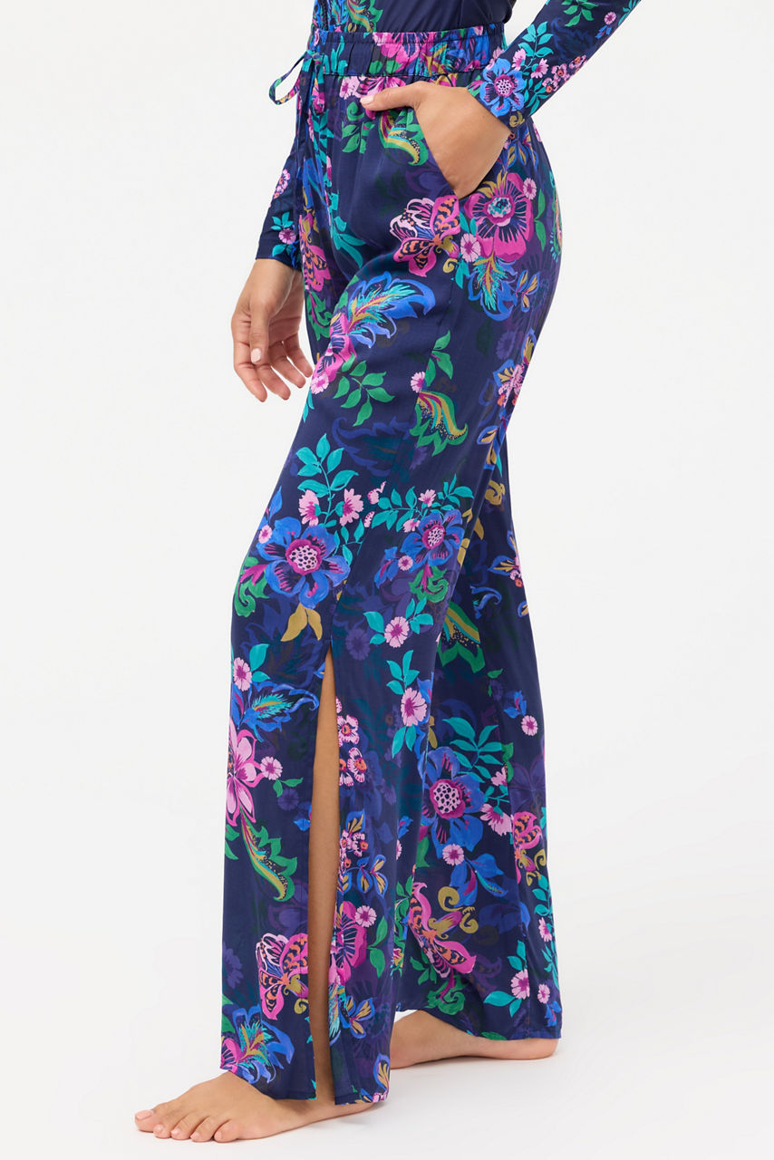 The Split Pant brings effortless movement and vibrant energy with its flowy silhouette and bold floral print. Designed with side slits, a comfortable elastic waistband, and a functional drawcord, it delivers an easy, breezy fit perfect for beach days or relaxed resort evenings. Lightweight and versatile, it pairs beautifully with swimwear or casual tops for a polished yet laid-back look.