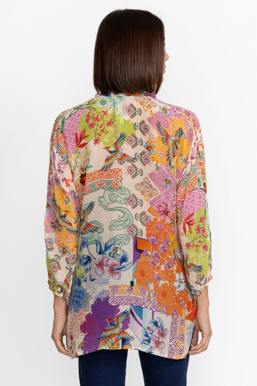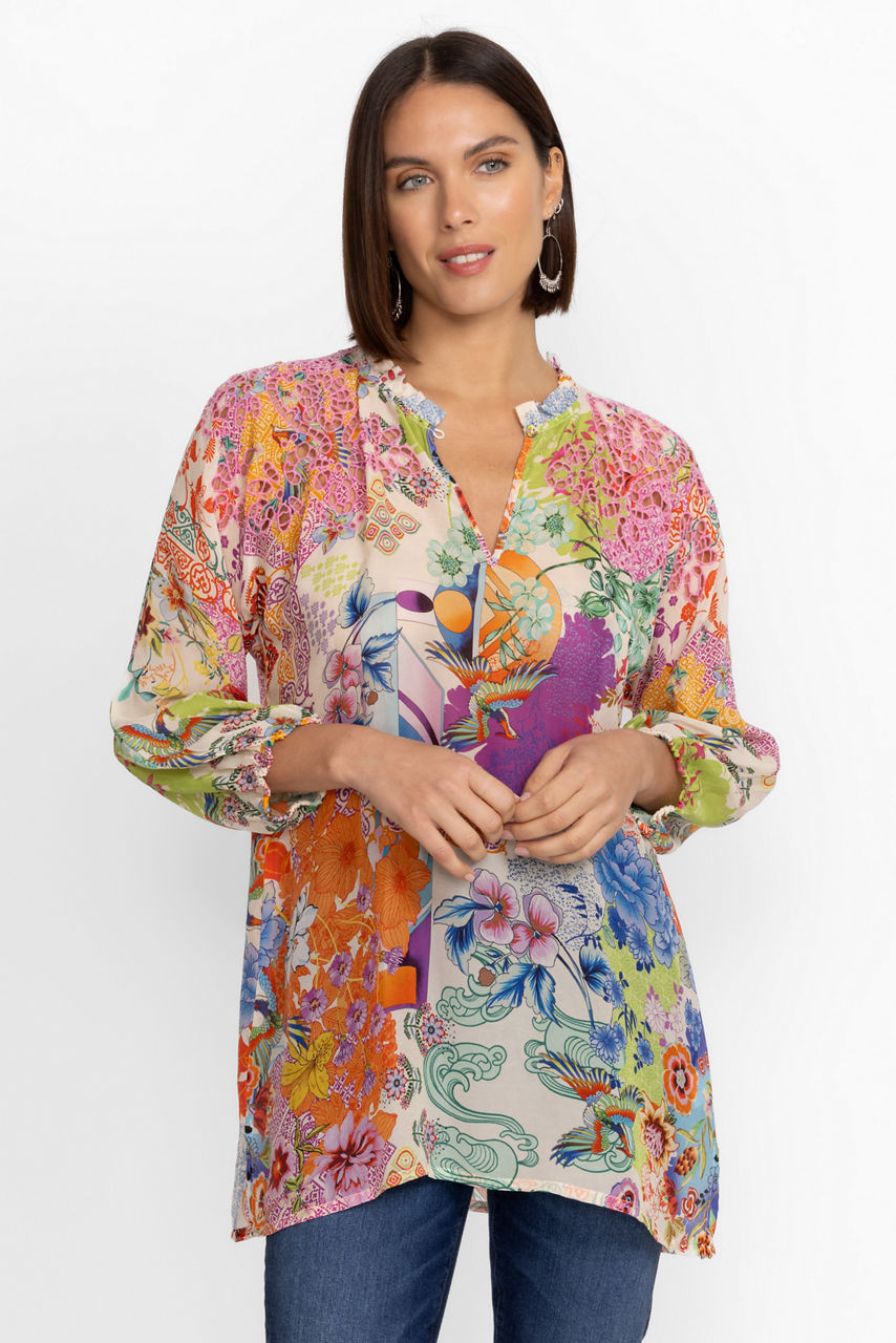 Offering comfort without sacrificing style, the Neeka Tunic is made from stretchy, lightweight material. Embroidered with bishop sleeves and a split V-neck, this piece stands out in vivid color. Pair with leather sandals for a beautiful daytime look.