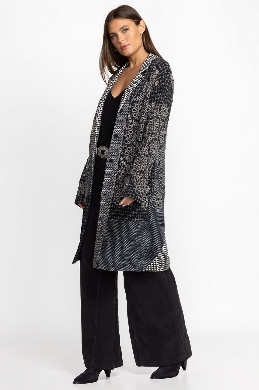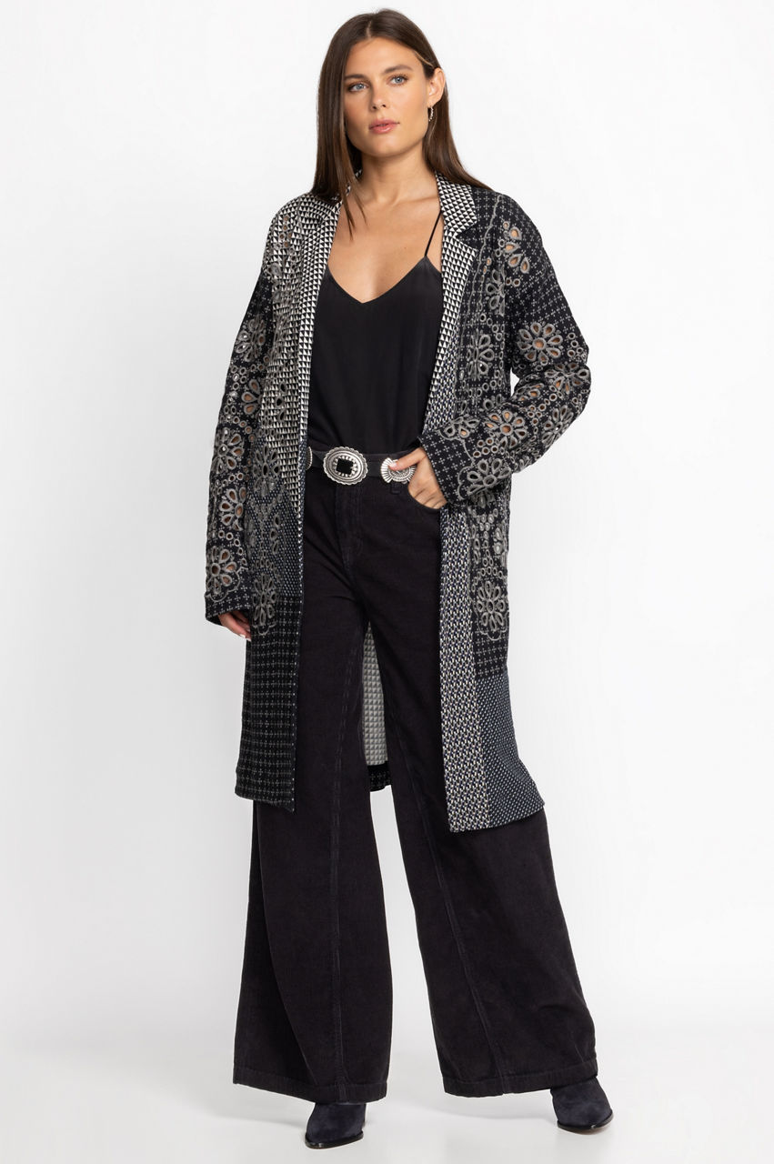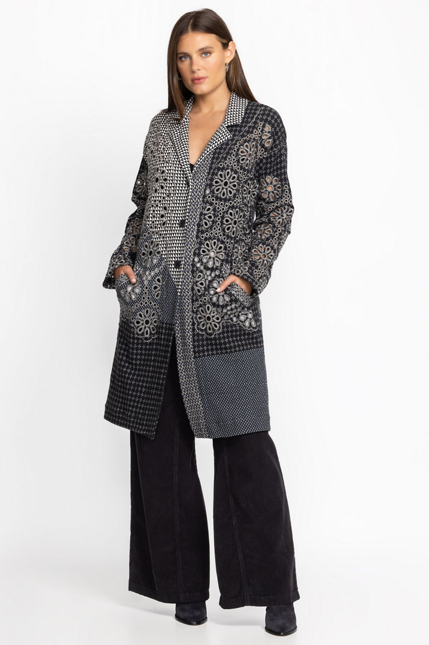 Displaying subtle pattern on a cozy full length layering piece, the Neelu Jacket is a study in embellished elegance. Distinctively decorated with ornate placement embroidery, this maxi jacket, offered in neutral tones, is a go to piece for the cooler season. Layer over your favorite denim paired with a comfortable pullover for maximum comfort.